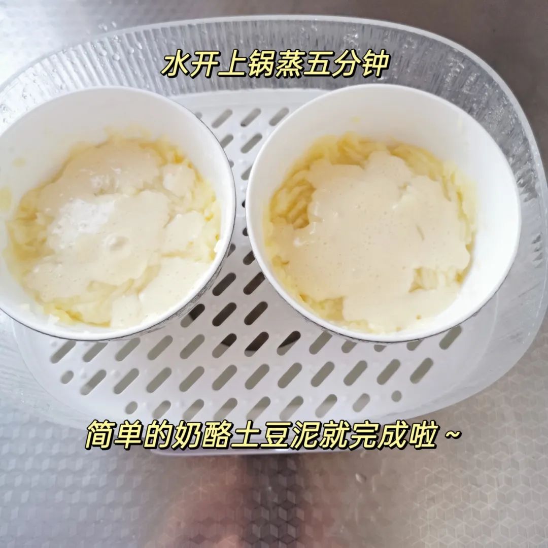 ④ 把制作好的奶酪土豆泥放入蒸锅,蒸5分钟至奶酪融化。