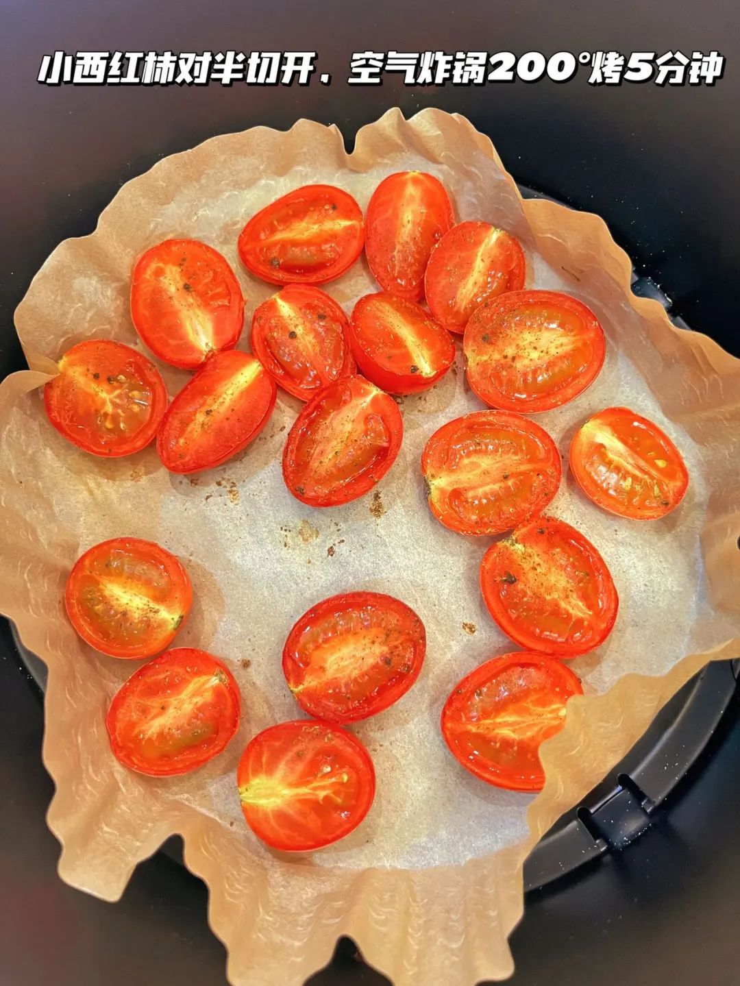 ③ 小西红柿撒点椒盐、橄榄油,放入空气炸锅200°烤5分钟;