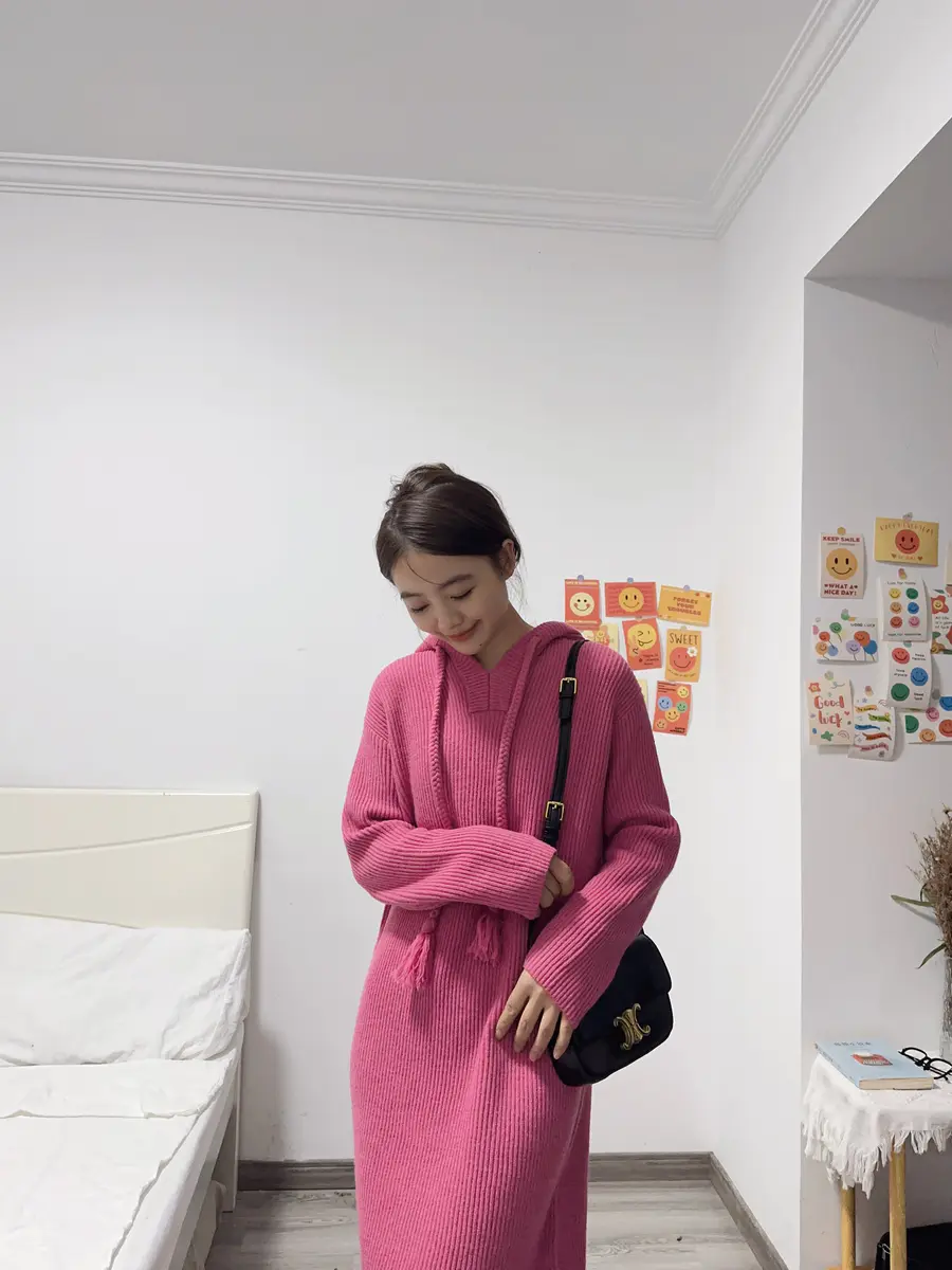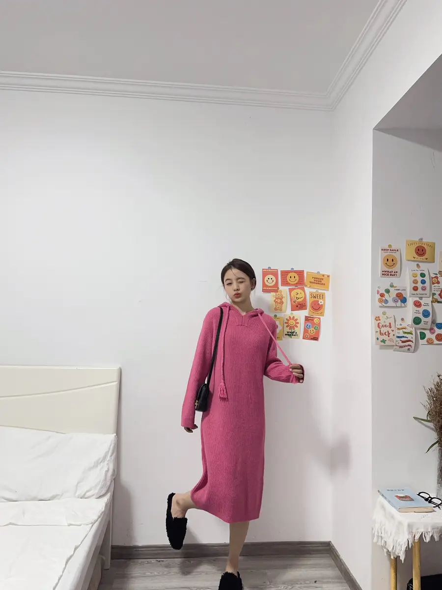这条毛衣裙真的太好看了!颜色鲜艳粉嫩,穿上去就像甜甜的棉花糖!而且带有连帽设计,简直就是少女心爆棚!直筒版型非常包容,遮肉效果也很赞,简直就是懒女孩的救星!