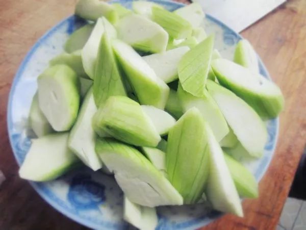 1、丝瓜洗净去皮,将丝瓜切成滚刀块备用;