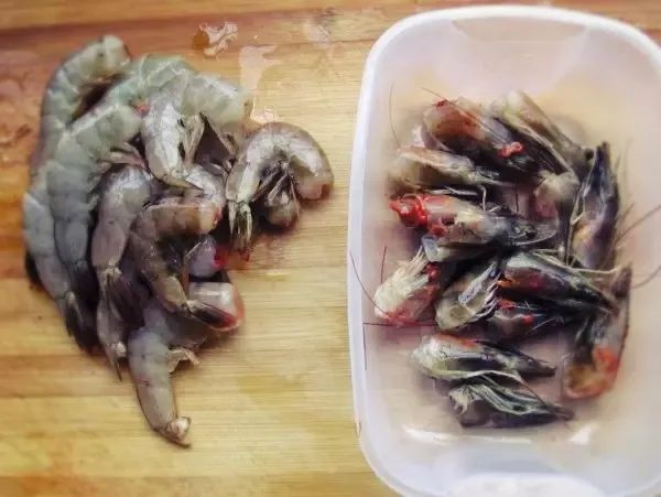 2、虾洗净,剪下虾头,去掉虾须虾枪备用;