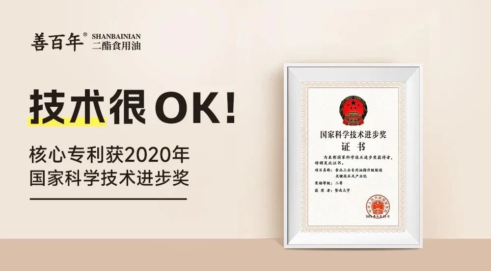 善百年,国内二酯油行业的开创者,一直与暨南大学深度合作,科研团队在健康油脂方面的研究已有 22 年。善百年二酯油采用绿色生物酶法制备,生物酶法是更安全的制备方法,比国际上原始的化学制备法更先进,二酯油核心专利也因此获得2020国家科学技术进步奖。