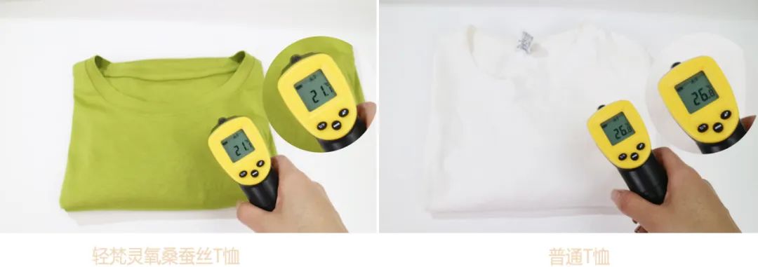 我们还特意测量了下它和普通纯棉T恤的表面温度。