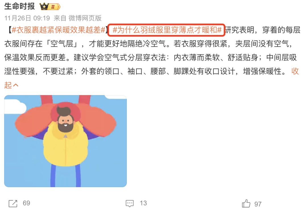 有了它,不用穿厚厚的里三层外三层,现在只穿一件羽小T薄薄一层就能更暖和、更轻便。