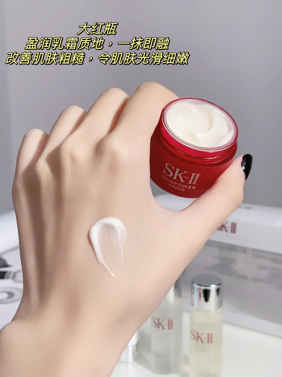 3️⃣Skll大红瓶滋润面霜15g:淡黄色膏体,质地柔软易推开,保湿性很好!改善肌肤多种问题