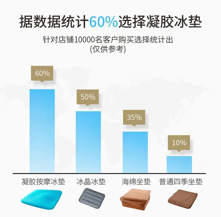 根据数据统计60%的人都会选择凝胶冰垫,说明冰垫是一种流行趋势,大众所爱,舒适的触感和冰凉的特性为它造就独特的优势。