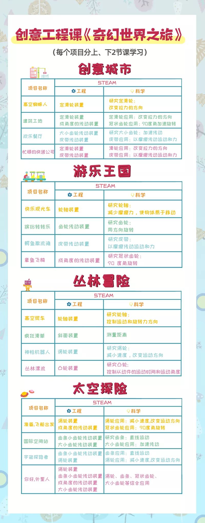 这门课涵盖4大主题搭建:游乐王国、创意城市、丛林冒险、太空探秘,每个主题4大搭建项目,合下来,一共16个,个个都是发圈会被爆赞的惊艳型设计~对了,因为涉及搭建技能之多,机械知识更丰富,这次咱们每个造型搭建都需要2节课来学习哦!