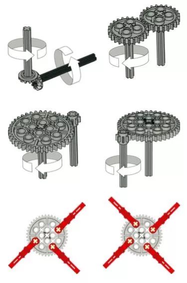 嘀嘀嘀!火箭运输车成功将飞船置放到发射塔啦!这个流畅的置放过程,就会同时用到“涡轮装置,来减小速度,改变运动方向”,以及“应用冠状齿轮实现90 度角旋”: