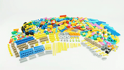 888片装小颗粒,包含大量创意积木,以及梁、轴、销、齿轮、轮毂等丰富的机械积木: