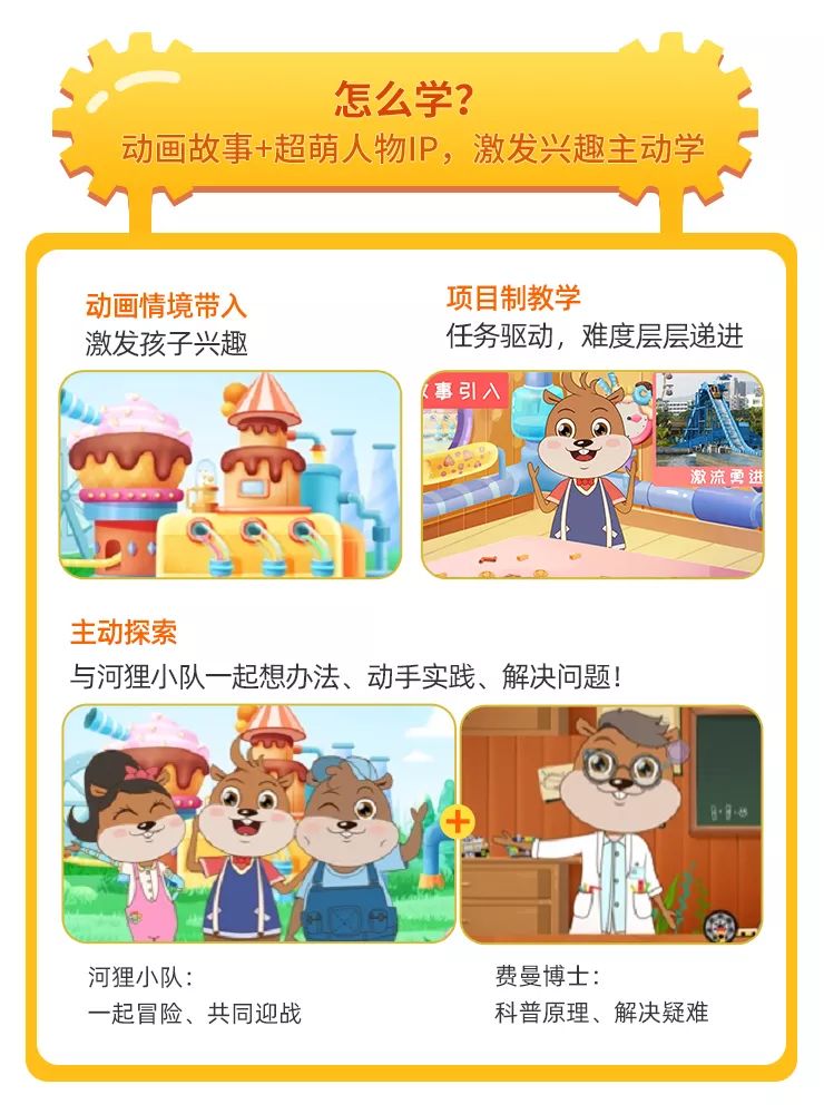 同时,课程内容,是孩子们最感兴趣的动画片,和憨萌可爱的小伙伴河狸小队,一起学习,共同进步;