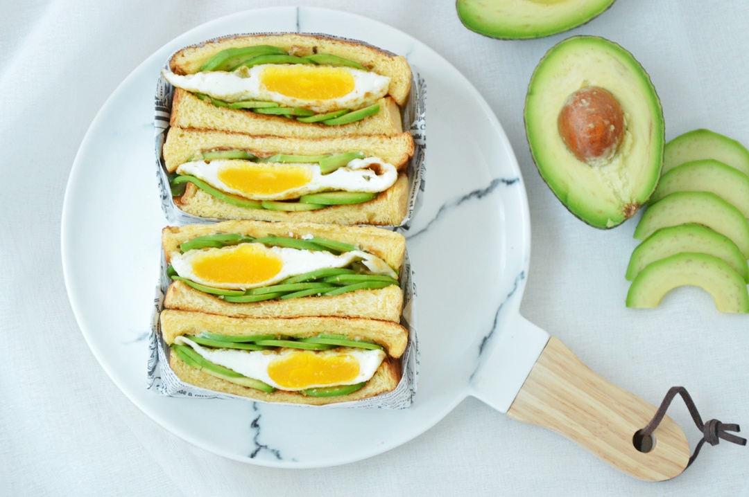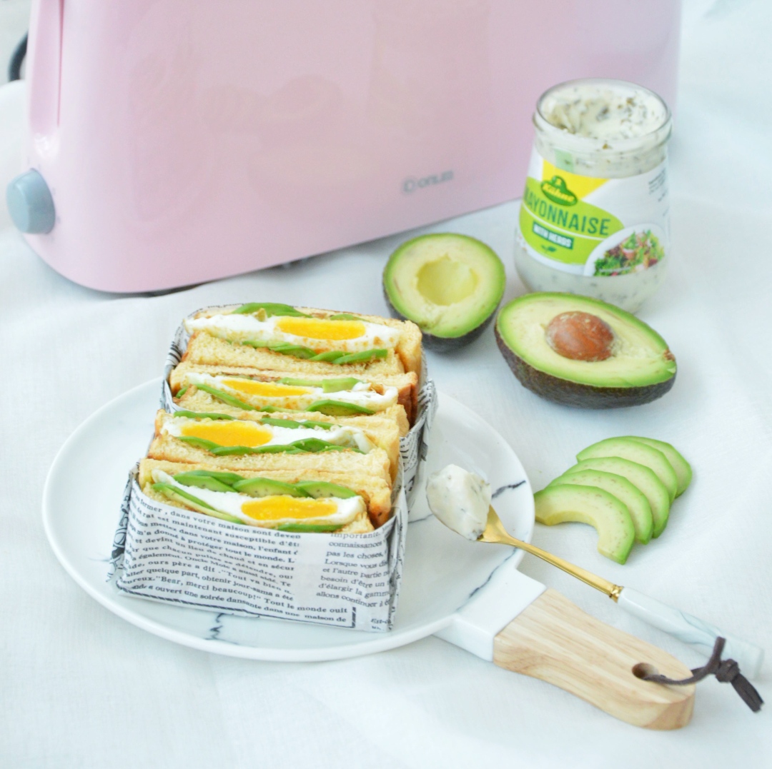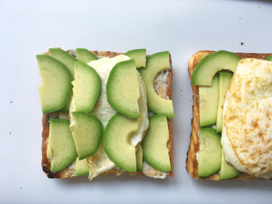 5、 在烘烤后的面包片上抹上适量的香草蛋黄酱,先铺上一层牛油果,放上煎好的鸡蛋,之后再铺上一层牛油果