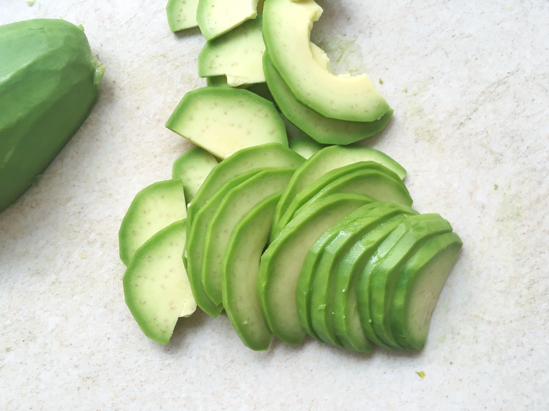 4、牛油果去皮,先对切开,去掉内核,之后将牛油果切片