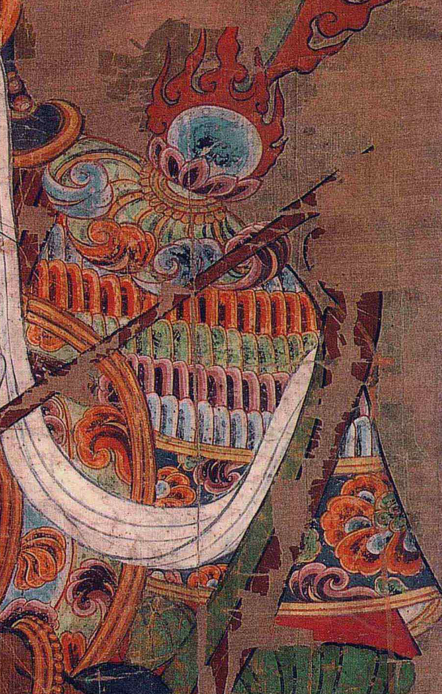 书中收录了一幅天王断片,铠甲的每段甲片设以不同的颜色,腰间的刺绣花纹和边革的修饰都富丽异常,实在让人叹为观止。