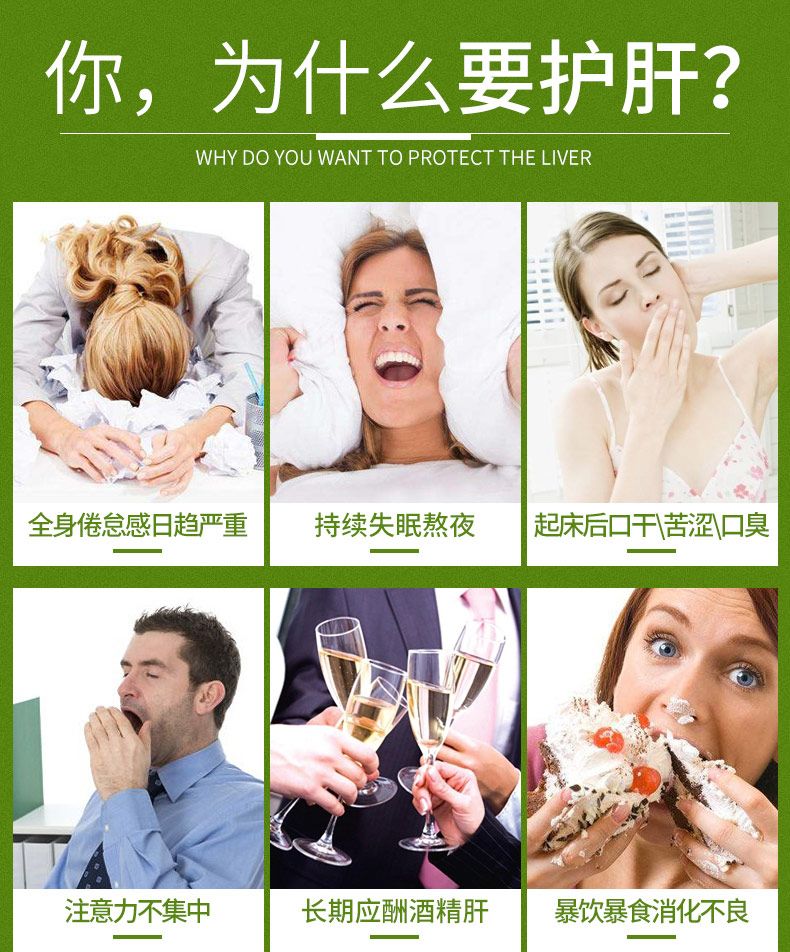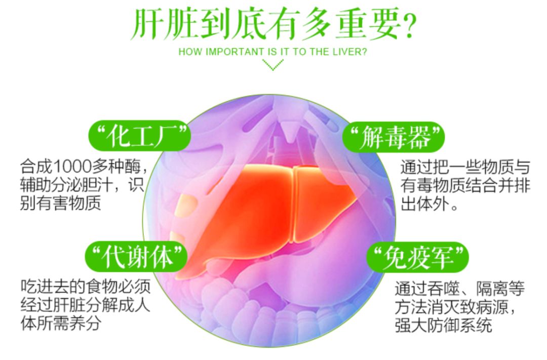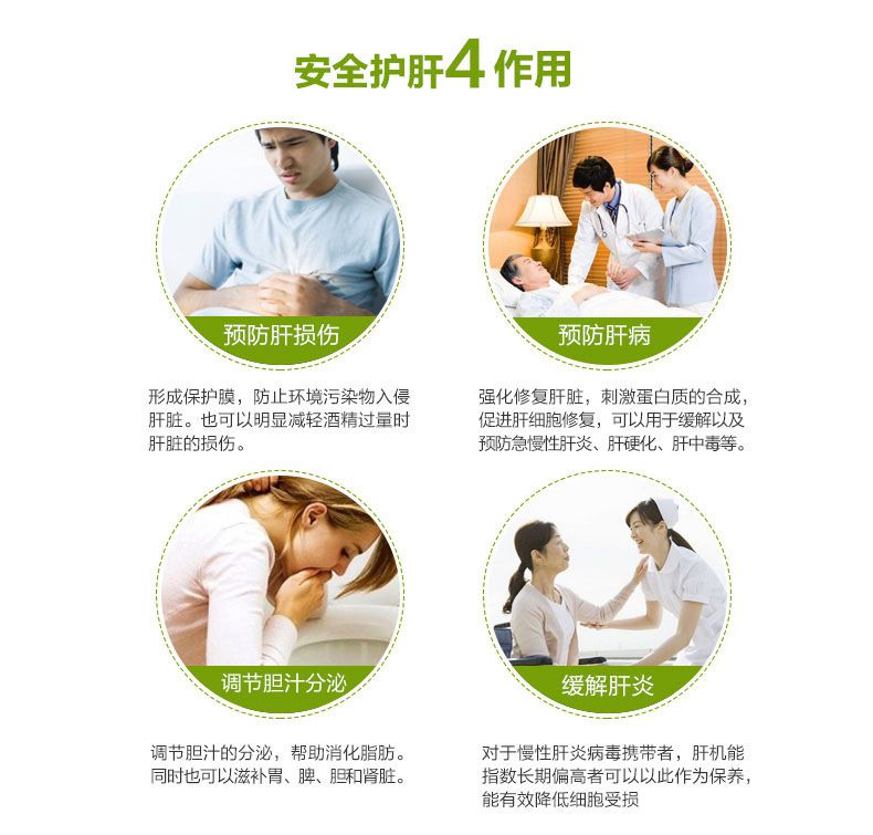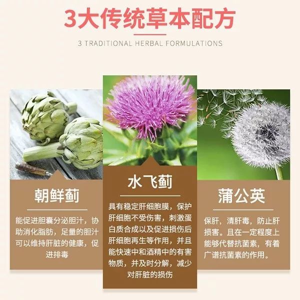 包含对肝脏细胞有修护效果的苦蓟萃取物水飞蓟素及多种有保肝解毒功效的其它成份,如洋蓟和蒲公英,可以帮助肝脏恢复机能,增强体内排毒功能,提高免疫力。