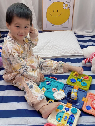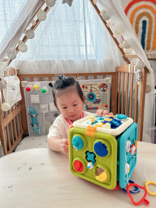 3️⃣再来,这款六面体的高度适中,不超过宝宝的坐高,就算是小宝宝,坐在地垫上高度正好,每一面都可以不费力地玩到。