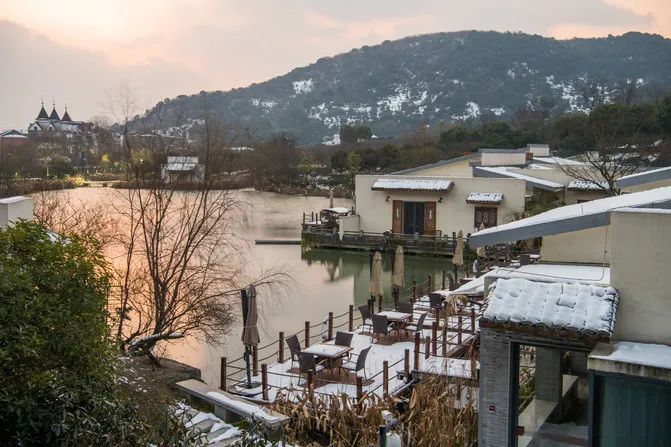 水墨蓉庄的粉墙黛瓦和亭台楼阁,与雪后银装素裹的超山北麓在一池碧波中交相辉映。民宿2800平方米的占地面积和5000平方米的湖面面积,融合为一派江南水墨风格画卷。