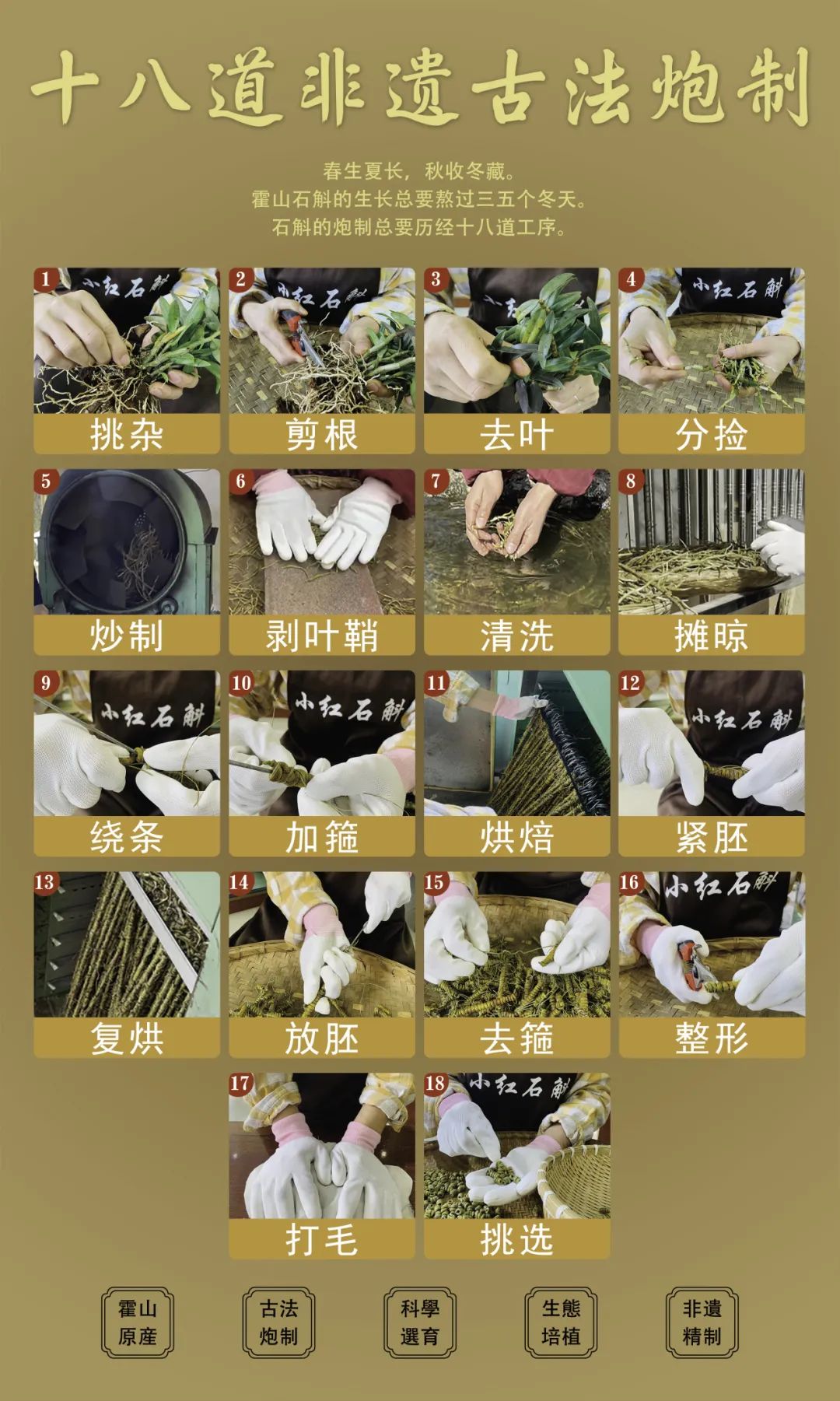 小红向您承诺,您所收到的每一克石斛,都凝聚了传统古法工艺的精髓与匠心。从选材到成品,每一步都遵循着世代流传的古法秘制工艺:
