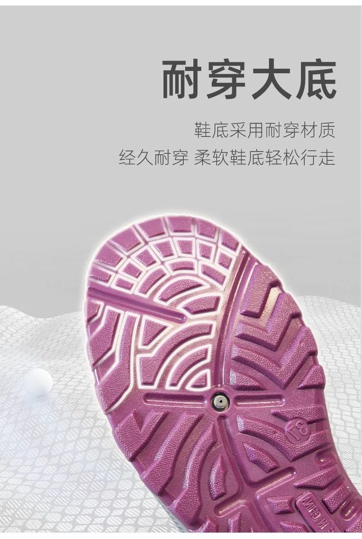 鞋子底部采用凹凸排水沟设计,防滑性和抓地力都特别好。