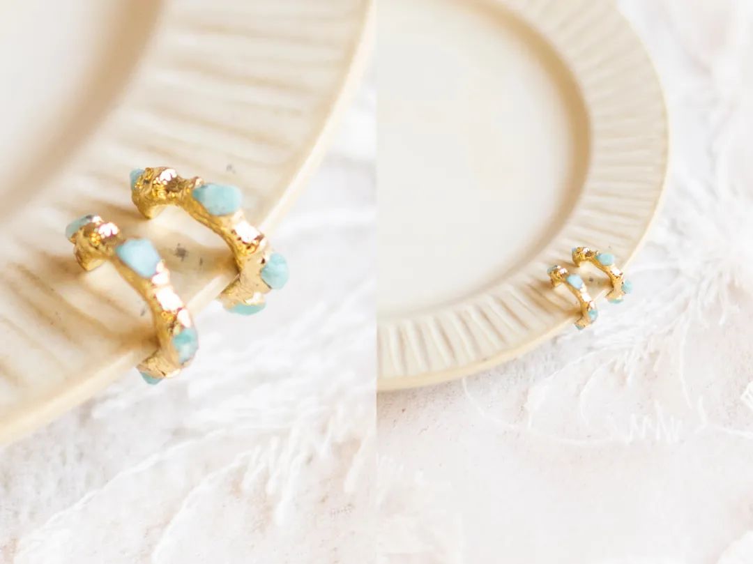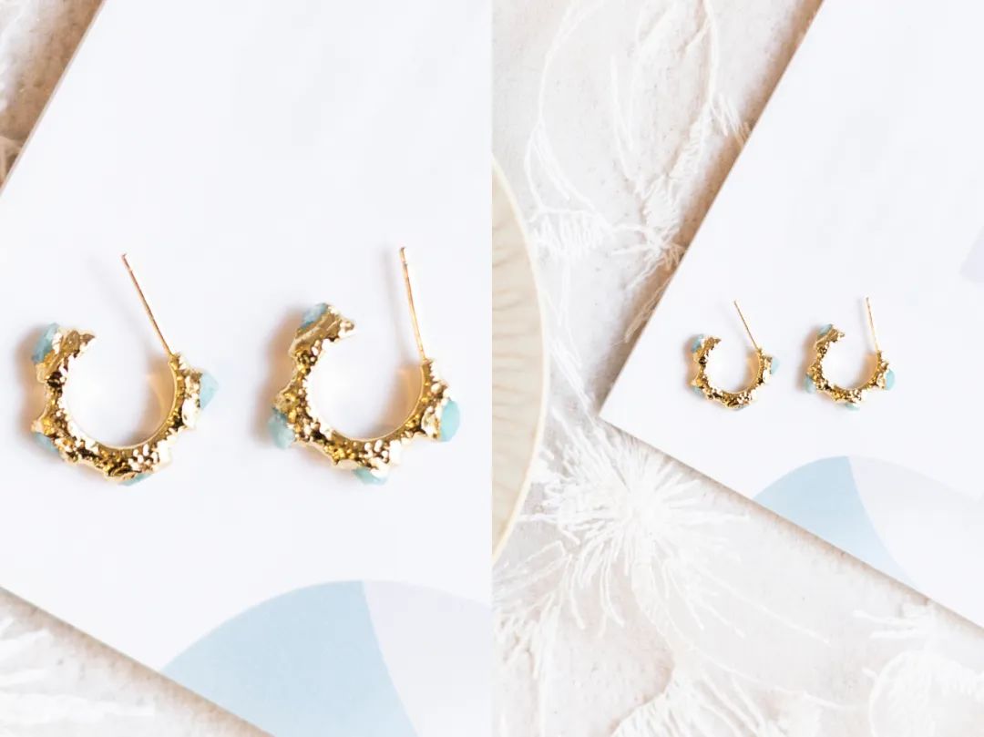 更小巧,金色耳环上面不是光滑的,添加了肌理感元素,有点褶皱的感觉。