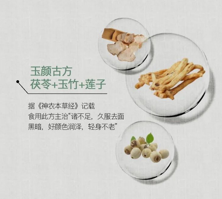 《神农本草经》记载茯苓+玉竹+莲子,煮汤食用主治“诸不足,久服去面黑暗,好颜色润泽,轻身不老”。特别针对水肿型肥胖人群,因为湿气、毒素堆积导致的脸色发黄长斑。