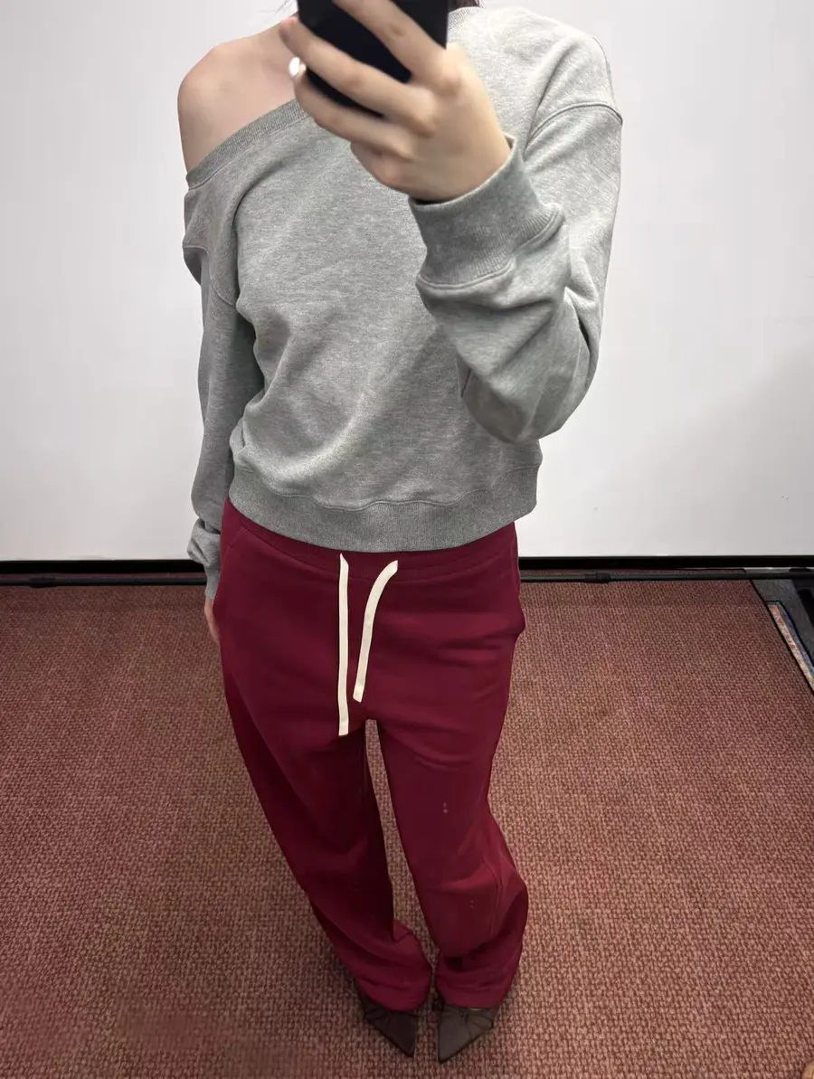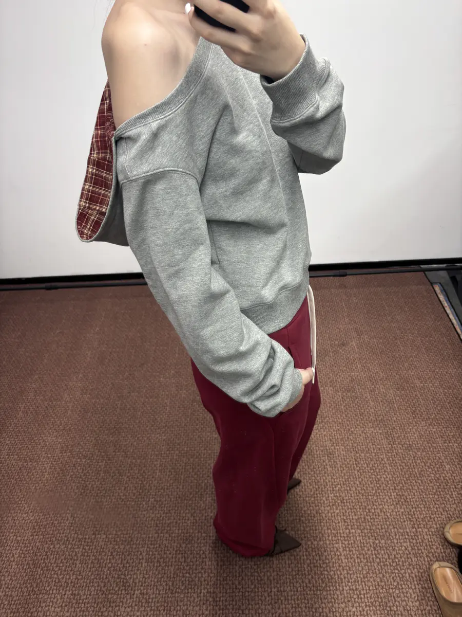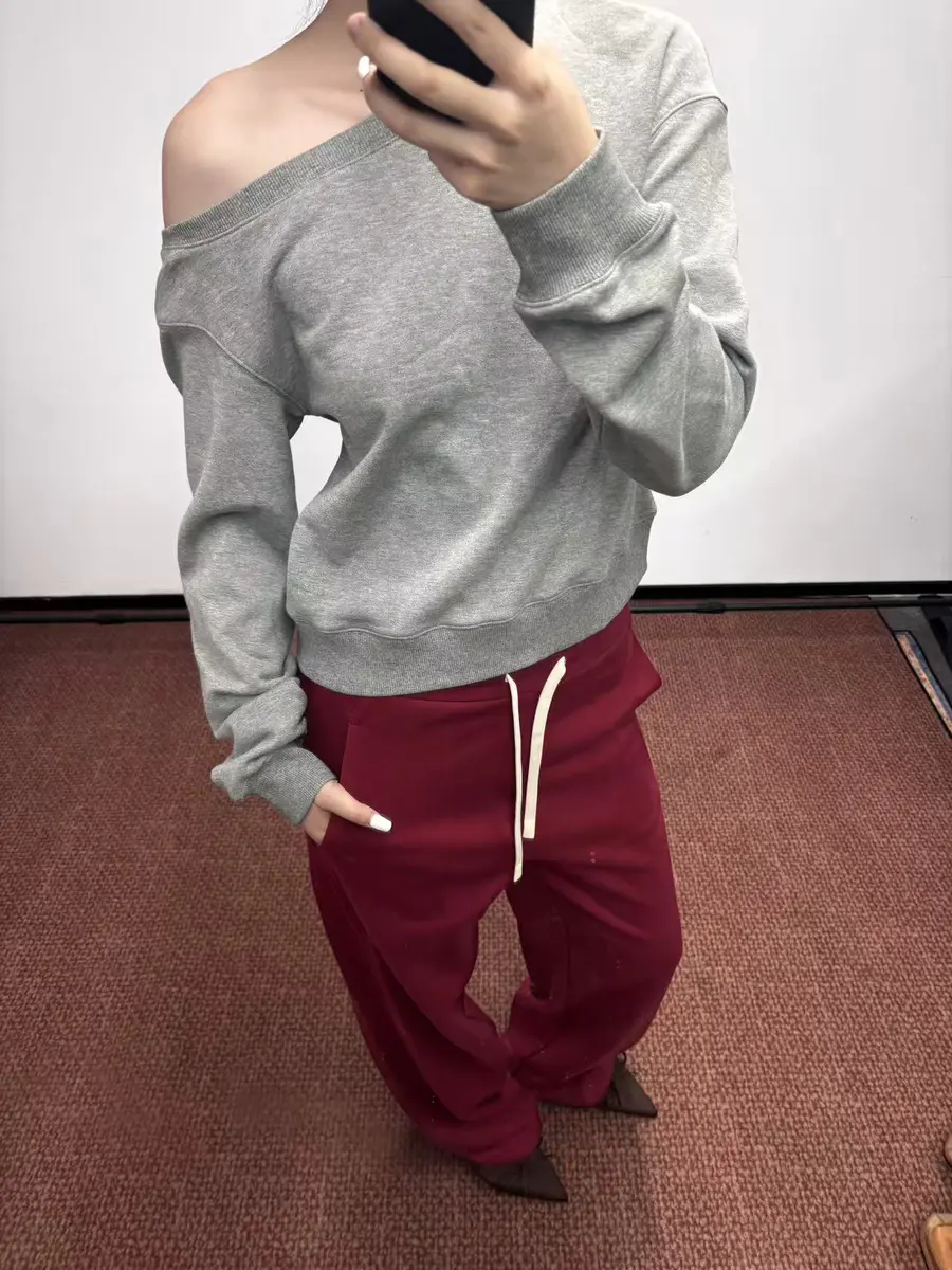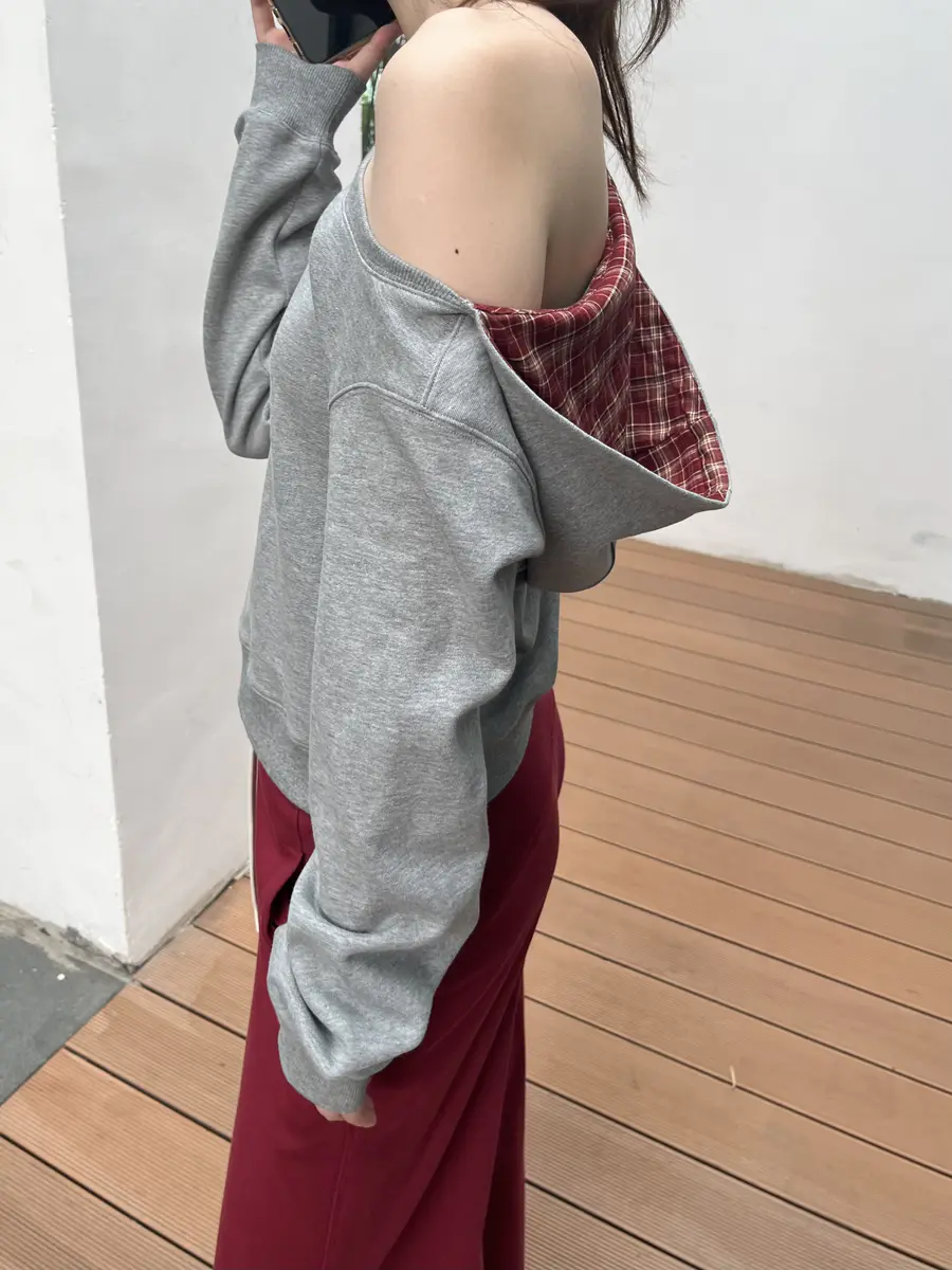 NUTH | 灰色斜领露肩修身短款长袖连帽卫衣
