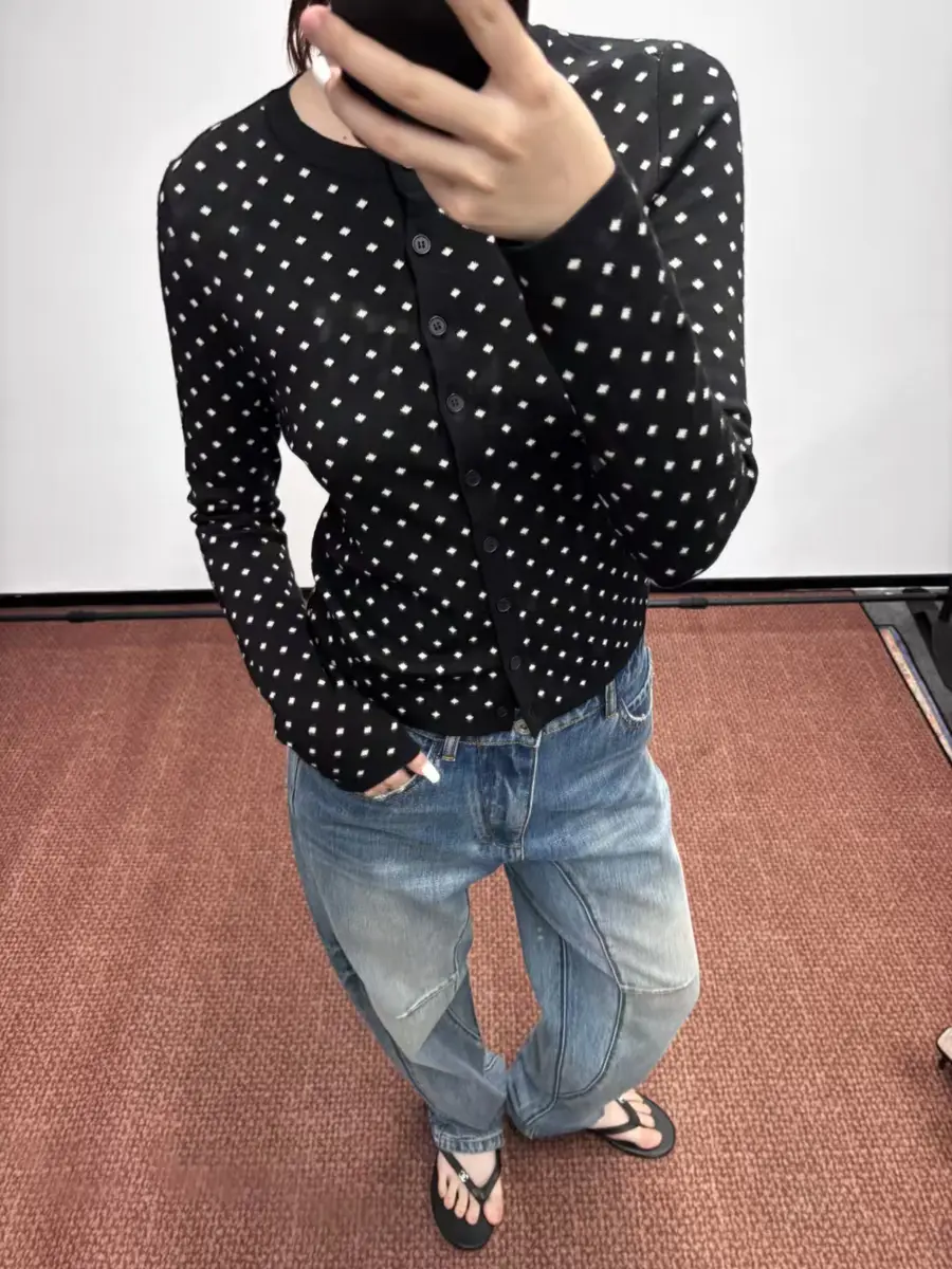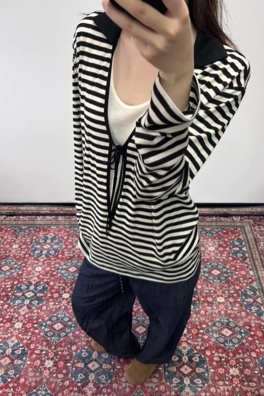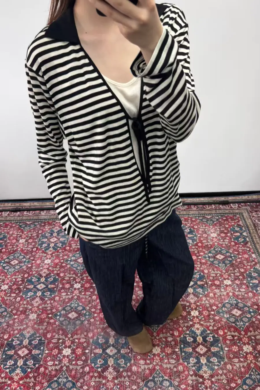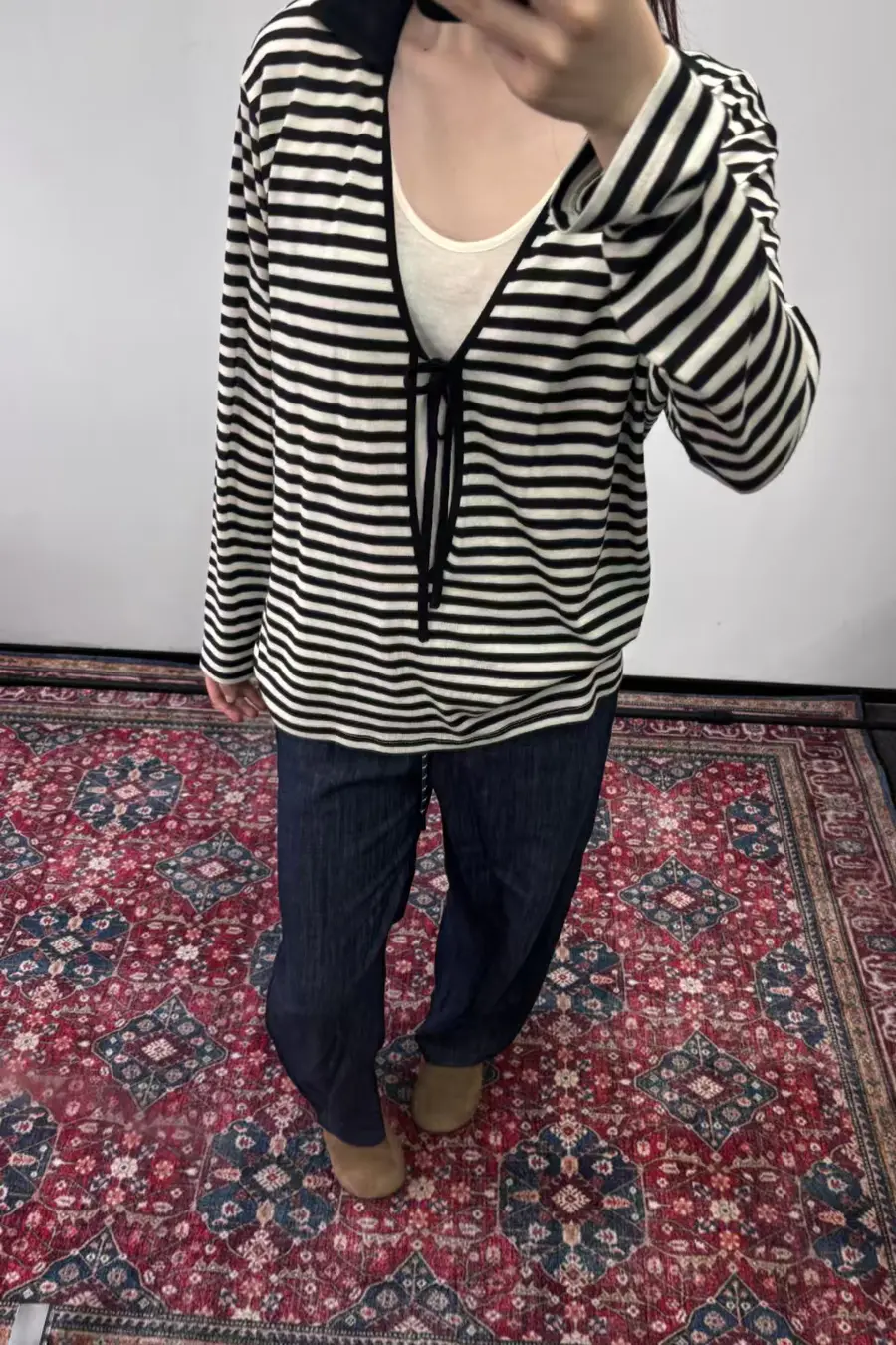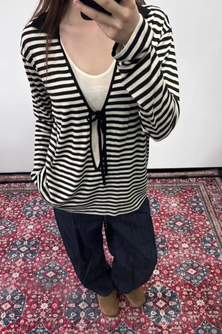 NUTH | 黑白条纹假两件v领系带宽松长袖中长款针织