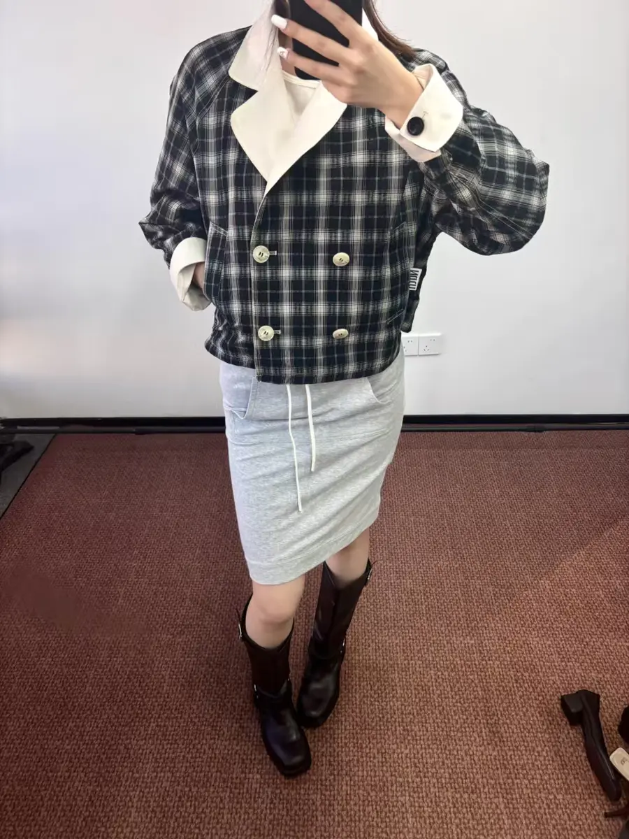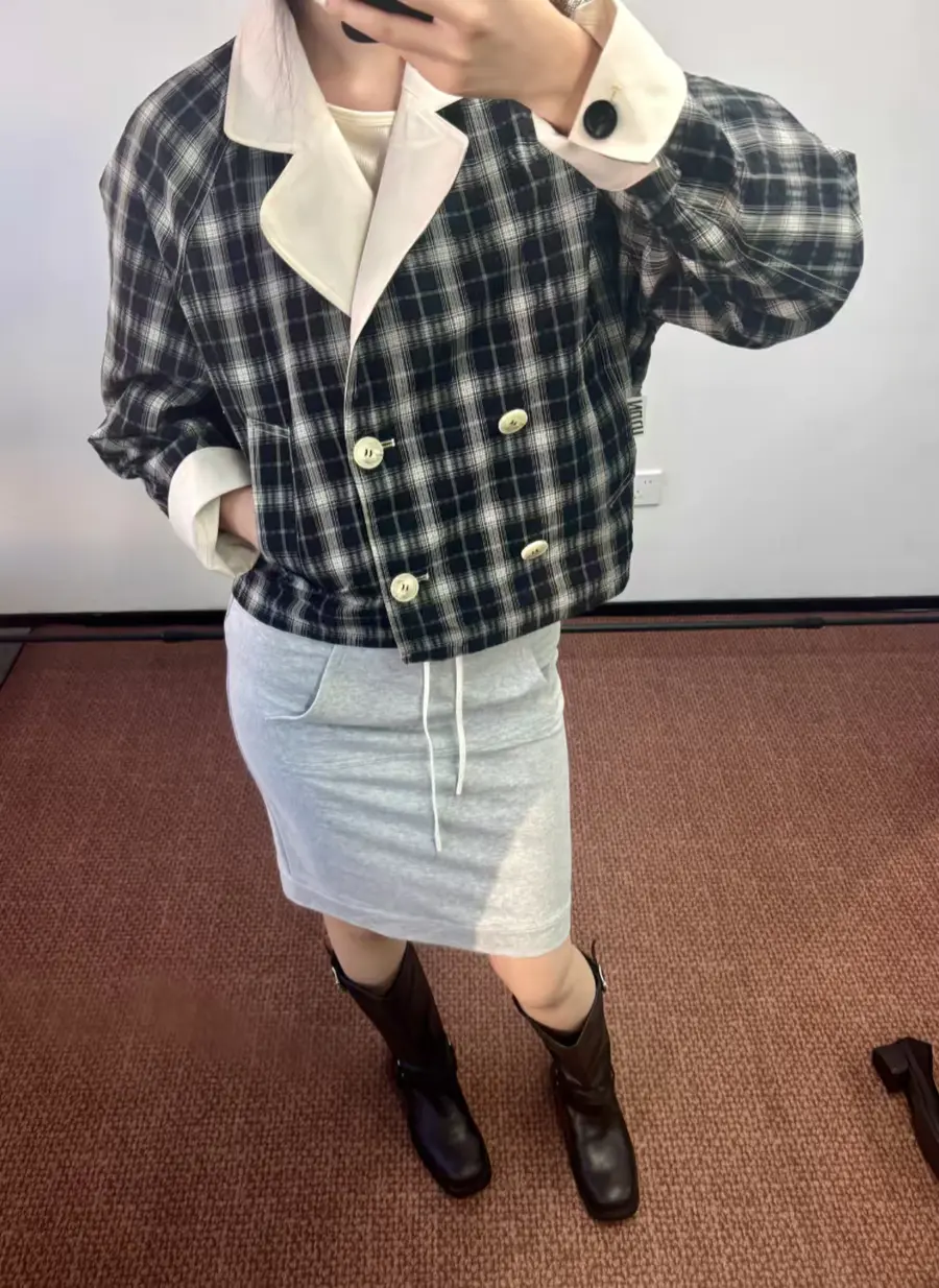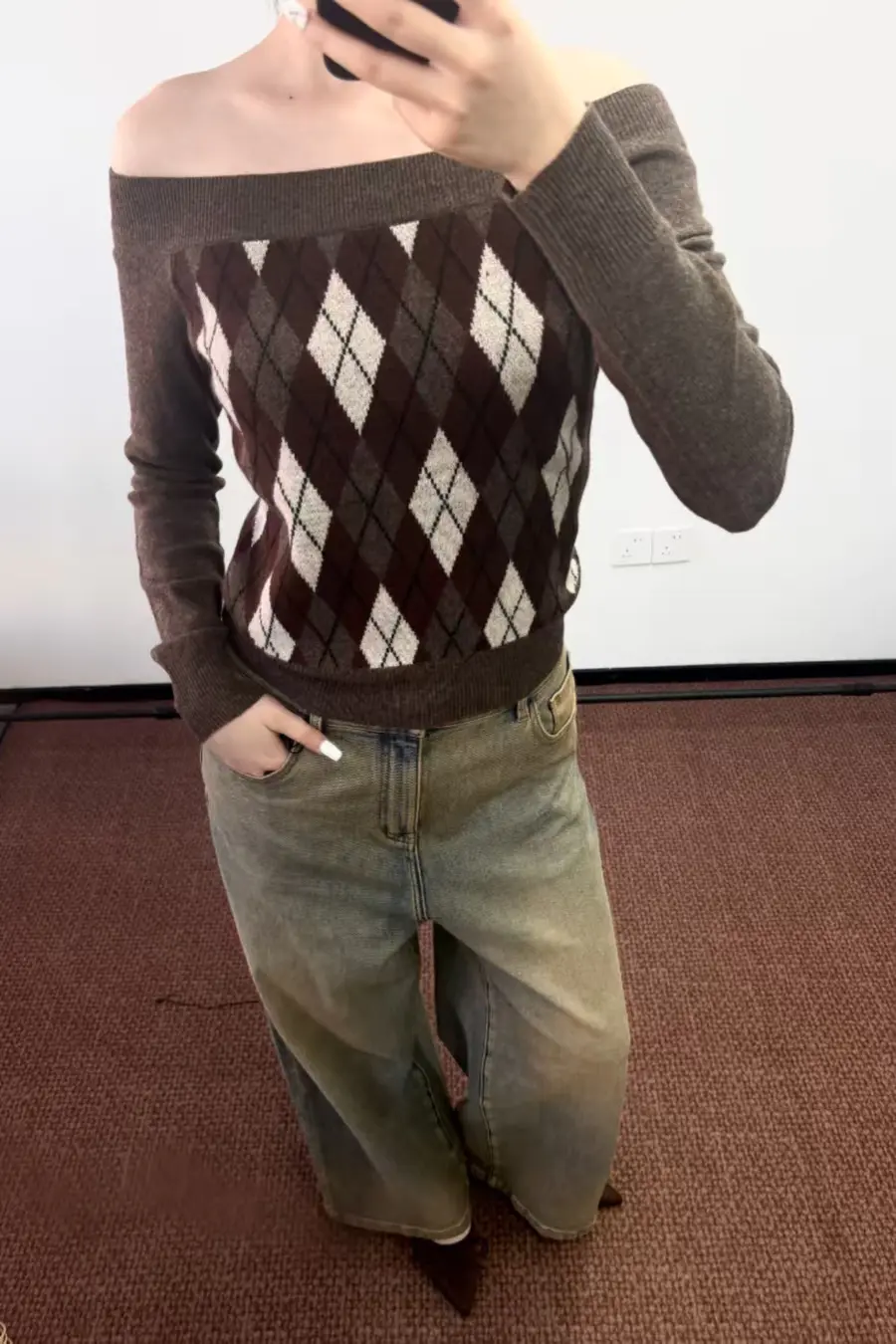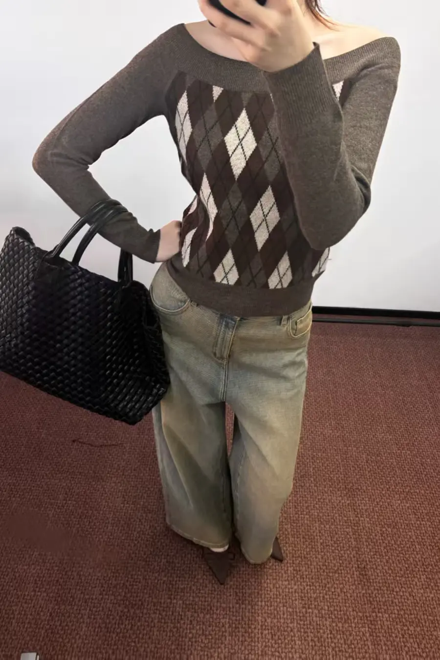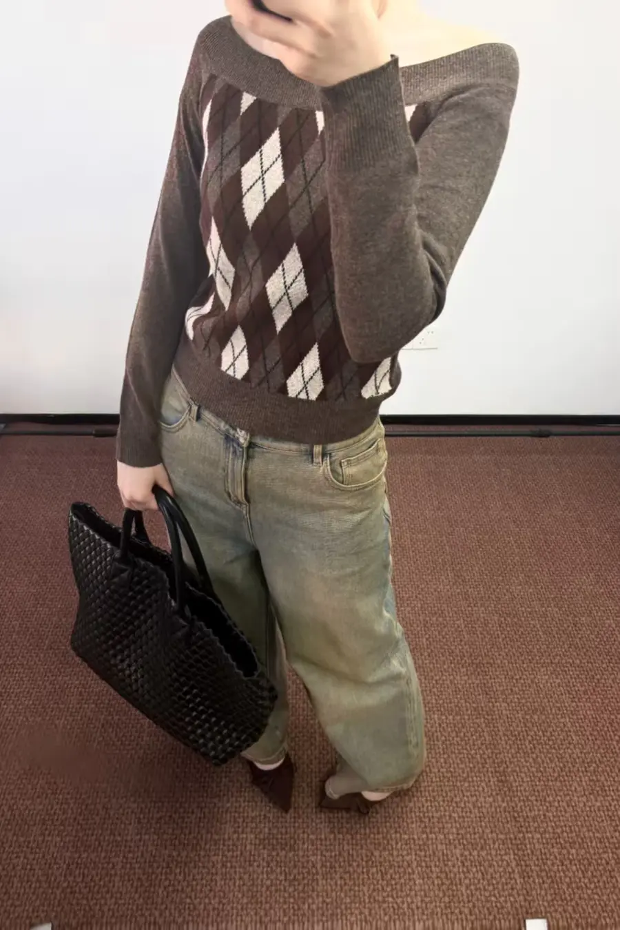 NUTH | 美利奴羊毛格纹撞色长袖一字领毛衣
