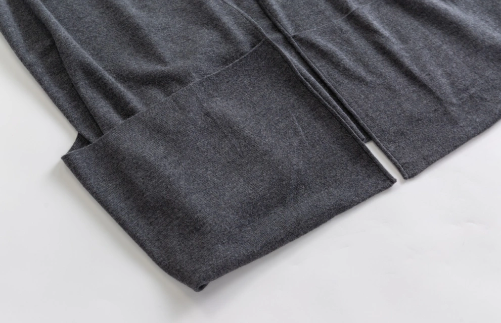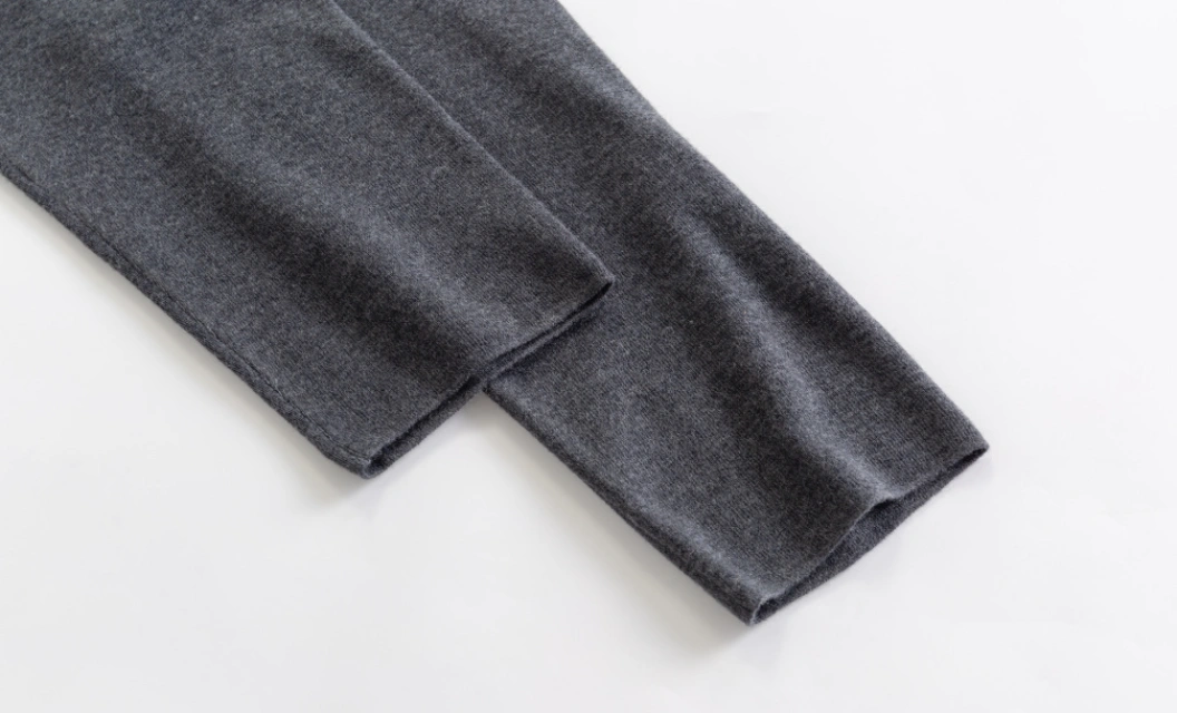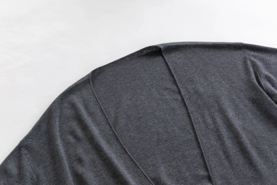 F:采用羊毛和蚕丝混纺面料,细密柔软,上身无刺痒感不扎肤,经特殊工艺染织出紧密细致的针织面料