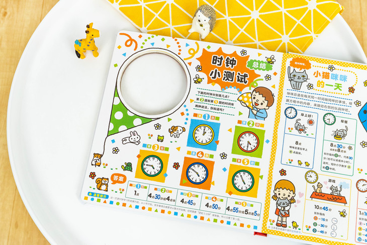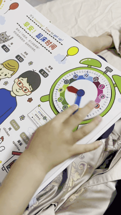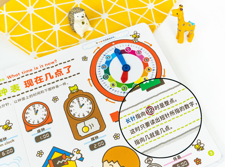 最贴心的是表盘的位置,是镂空固定在书的右上角。表盘下方是时间概念的解释,孩子学习时,可以直接根据文字和图示,一边拨动表盘上的指针,一边观察:整点、半点是什么样的,八点十五分、九点四十分时,时针和分针分别指向哪些数字,在摸到表盘、看到时针分针的变化、听到时间咔哒咔哒的走动里,理解时间概念。