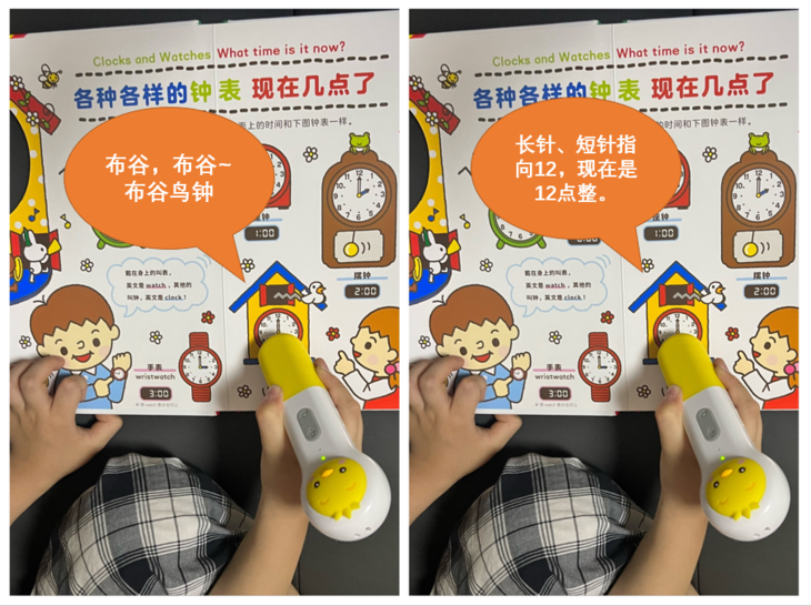 另外,这本书支持PIYO PEN点读笔。碰到不会读的时钟,孩子可以借助点读,将图片和点读讲解结合起来,自己就可以认读时间。除了讲解,还会有延伸知识,如点击猫头鹰图片时,不仅能读出猫头鹰的英文,还能知道猫头鹰是森林医生,丰富孩子的学习经验。