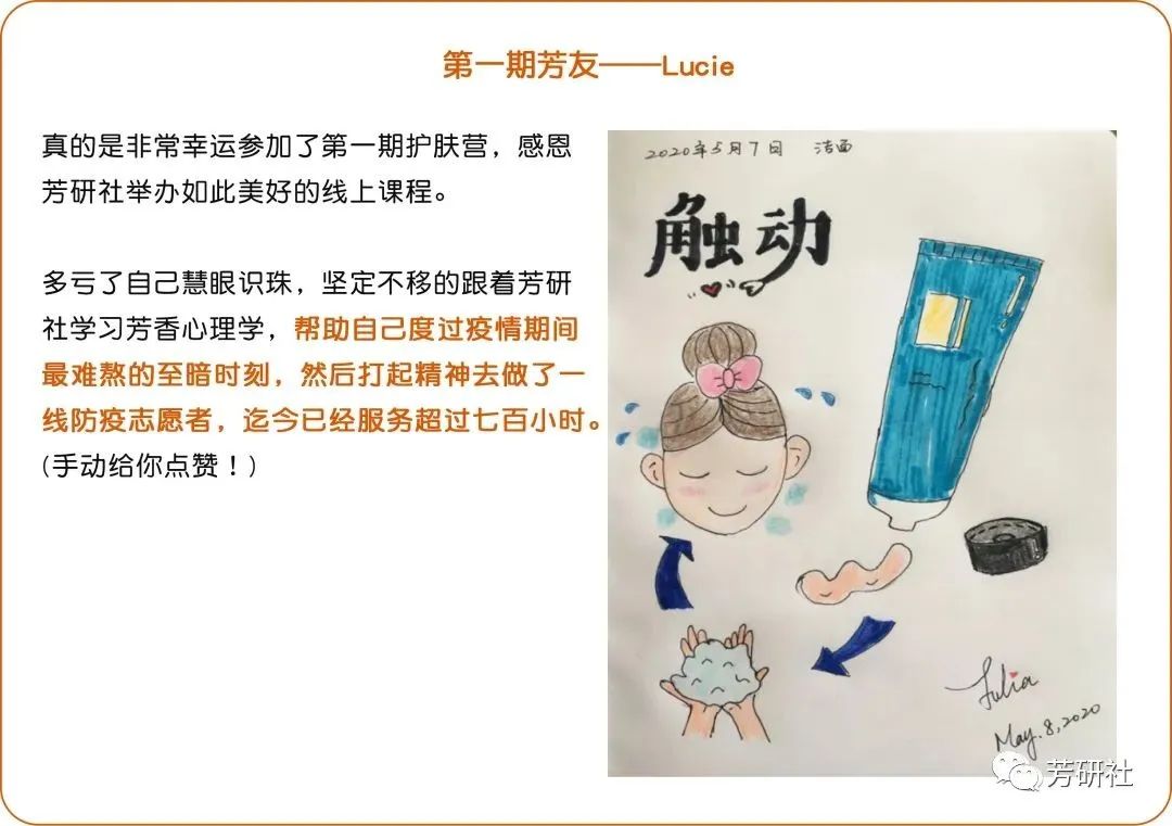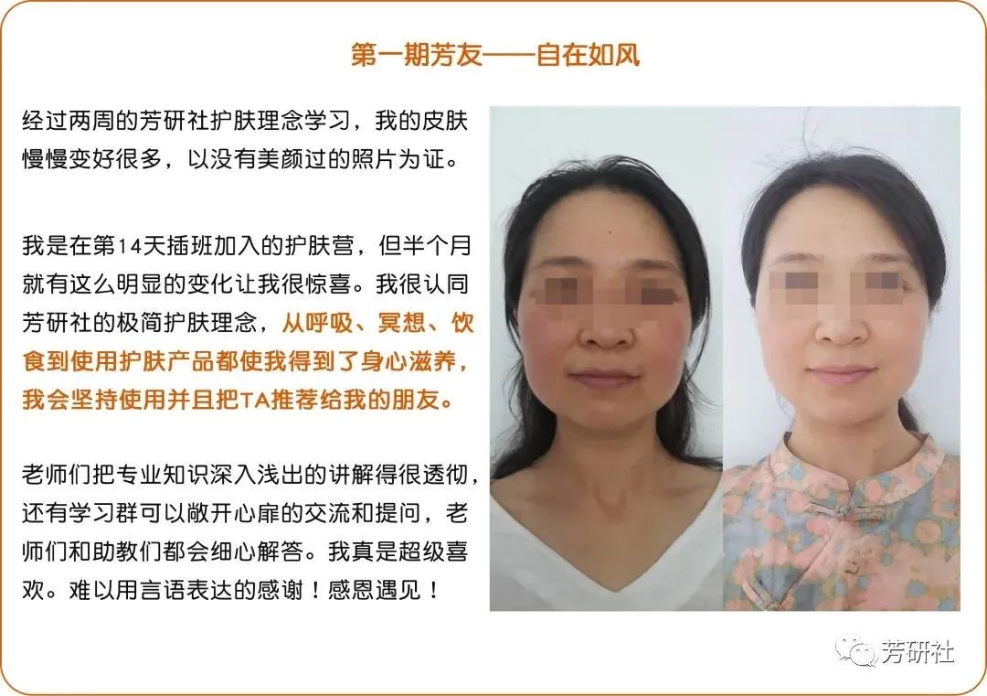 所以在正念护肤训练营中,不仅仅是对护肤知识的分享,更是从实际行动上每天带领大家去做呼吸练习和正念冥想,从护肤这件小事上单点突破,让我们习惯于每天有一小段时间很放松、很满意地跟自己在一起,从而真正开始爱自己,拿回自己的力量。