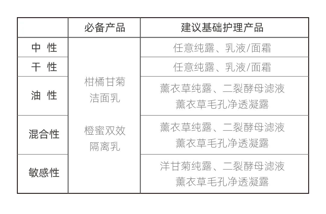 虽然我们对于产品没有硬性要求,但还是把各种肤质类型会用到的产品做了一个建议列表,大家可以点击这个链接大致了解自己的肌肤类型,准备好产品,开始和我们一起踏上变美之旅。