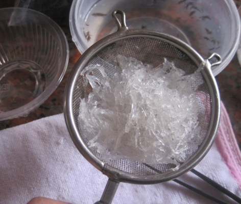 注:挑毛时,先挑出燕毛,再把燕窝放在漏网里,在下面放个小盆,然后放在水龙头下面冲水,要来回的摇晃漏网。