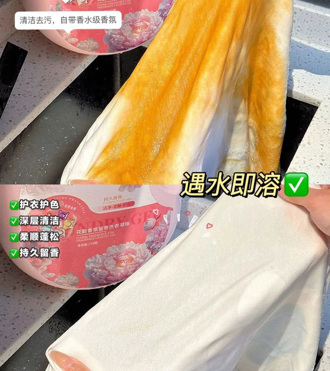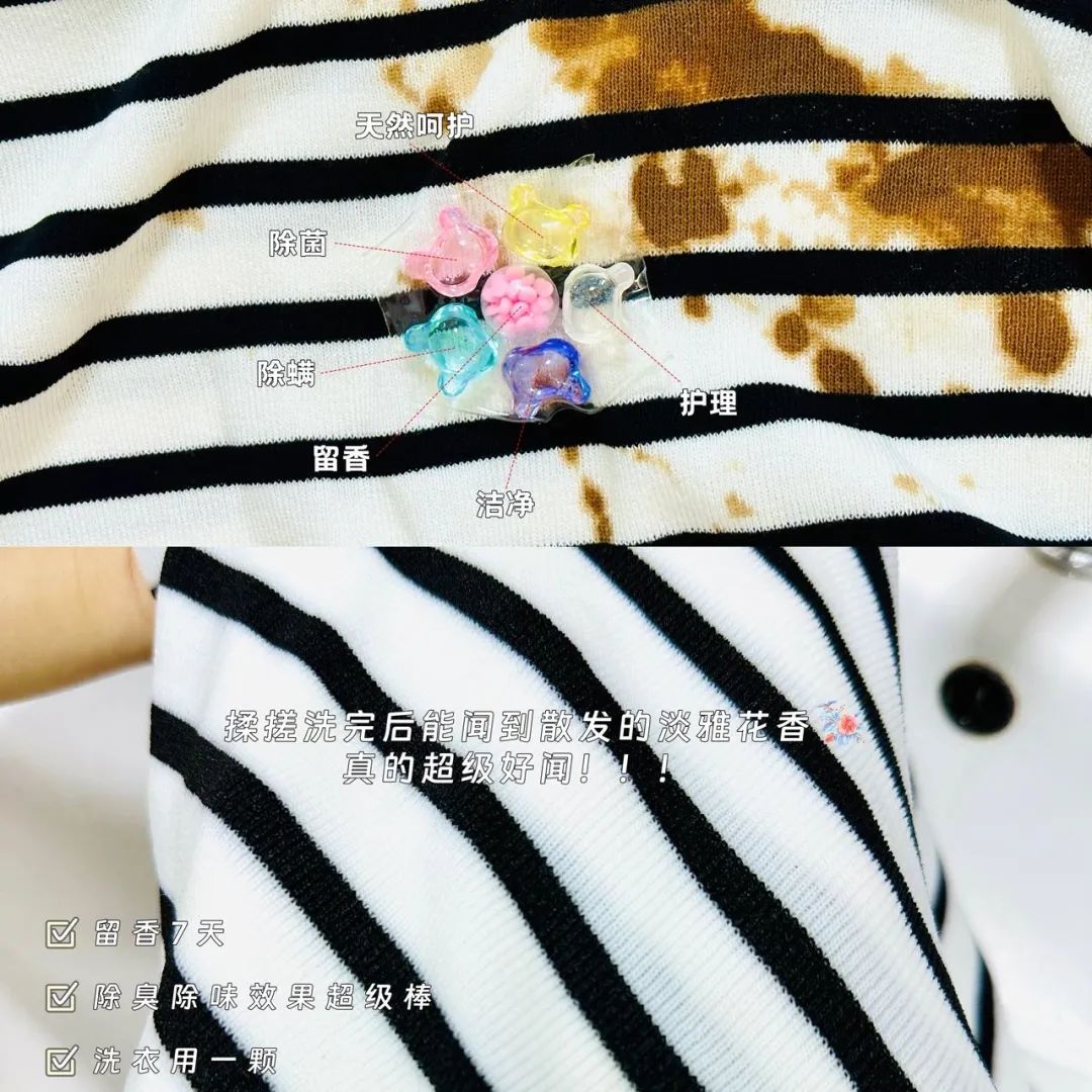 除此之外,丁家宜家的洗衣凝珠最大的特点就是留香超持久,它的留香方式和时间都和市面上洗衣液、洗衣凝珠大有不同!