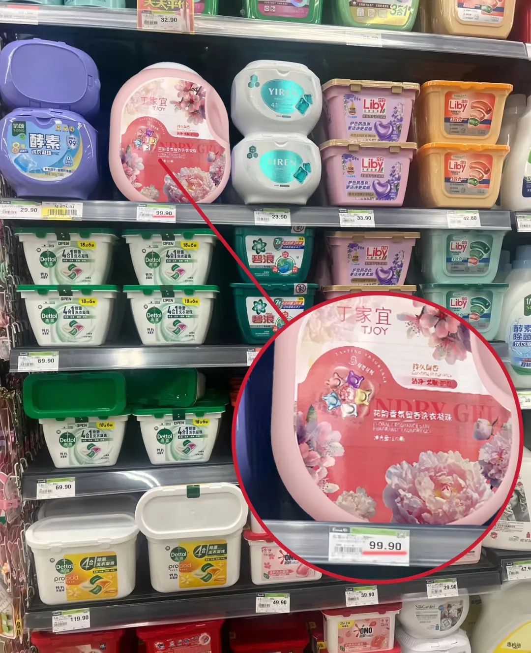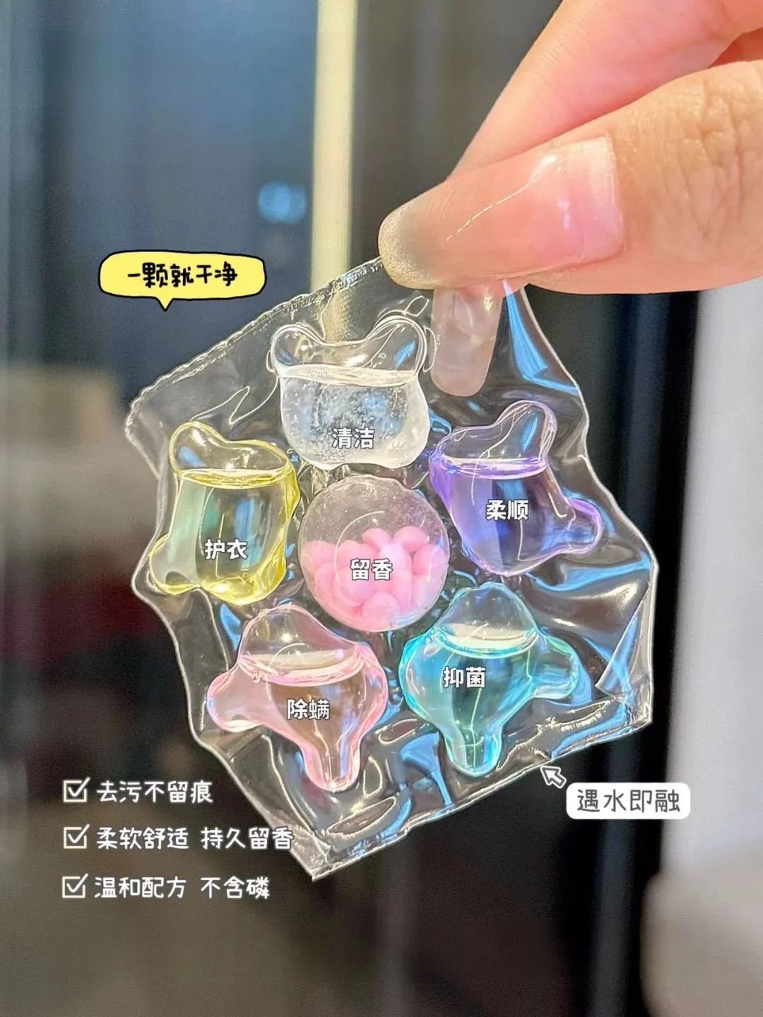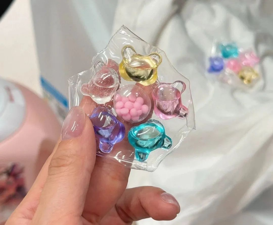 丁家宜家的一颗洗衣凝珠包含了清洁剂+除螨除菌剂+柔顺护衣,一颗抵别家几颗,外层包裹了透明膜。也就是说,一腔就等于一房,每一房都负责不同功效。