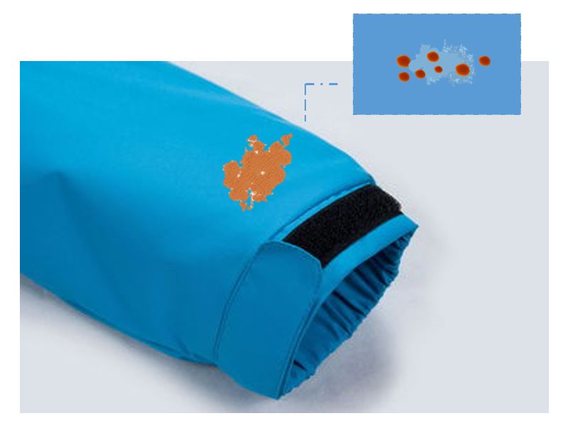 当污垢通过了第一层防护,便会很容易开始侵袭中间层的薄膜,薄膜被污垢堵塞,这是整个保护系统最核心的区域,冲锋衣的防水透气功能便慢慢丧失了!