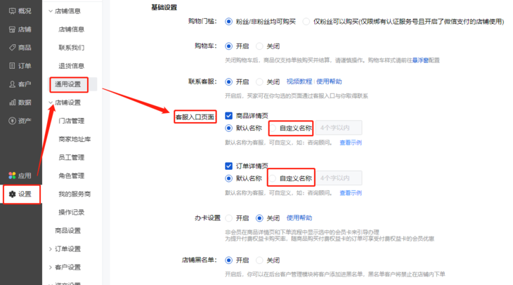 a:在「通用设置」页面的「店铺设置」下开启联系客服,客服入口页面中勾选商品详情页,默认名称为客服,支持自定义名称,如这里自定义为:“哈喽小秘”。
