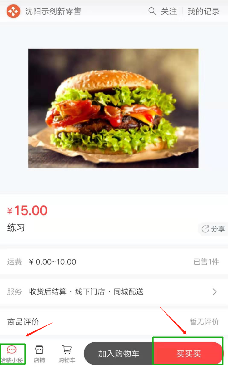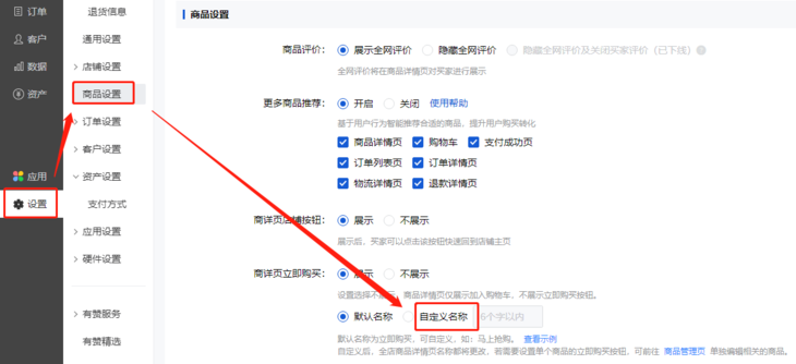 b:在「通用设置」页面的「商品设置」下选择展示商详页立即购买,默认名称为立即购买,支持自定义名称,如这里自定义为:“买买买”。