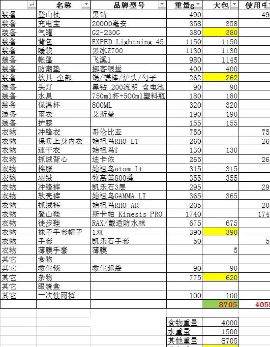 对于鞋子,必须两双鞋子。一双是平时穿的重装徒步鞋,必须是中高帮的,这样可以行进过程中最大限度的能保护到自己。另外过河的时候一定要有一双靠谱的溯溪鞋。因为溯溪鞋普遍比较软,因为溯溪鞋有3天几乎是在全程穿着的,过软的鞋子很咯脚,所以一定要选择一双鞋底结实点的,保证行走的舒适性。另外溯溪鞋尽量选择轻量化一点的,太重的大大的增加了自己的重量。