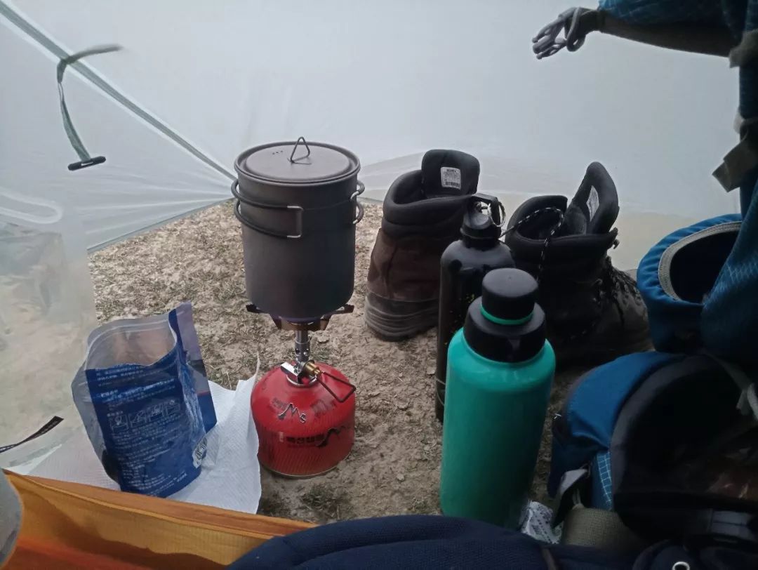 关于水具,9月刚好不热不冷,所以正常一天1.5升够喝,当然这个是针对我自己。带了一个800ml的保温壶和一个700ml的铝壶,正好满足每天的饮水。晚上还可以把热水让铝壶里面热睡袋。