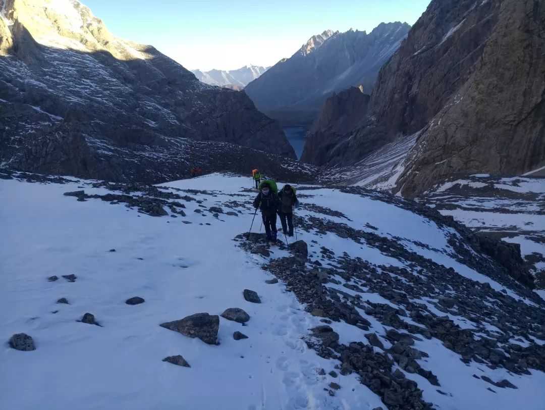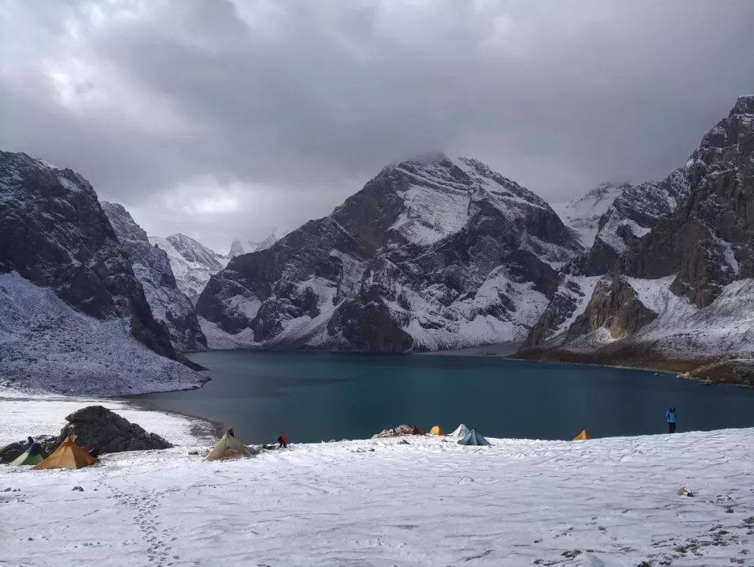 天堂湖,是海拔3100米左右的一个天然高山湖泊,四面环山而形成的一个堰塞湖,湖水呈现碧蓝色,加上周边就是全是山峰,看到湖泊容易,蓝色的湖泊也很多,山边蓝色的湖泊也很多,但是崇山峻岭异常险峻的山峰边就是湛蓝湖水,倒影山峰白雪的湖泊,真的可能就这一个。因此今天的目的的就是天堂湖,扎营在天堂湖。从营地出发就开始拔高,今天的拔高很有意思,前几天看到的都是河流树木和远处的山峰,今天看到的全是山峰,越来越多的山峰而且特别的陡峭,就在自己的走过的身边,一个接一个陡峭的山峰。因为这个时候海拔已经很高,到了雪线之上,脚下的雪也越来越厚,我们知道天堂湖马上就要到了,果然一转眼天堂湖就呈现在眼前了。
