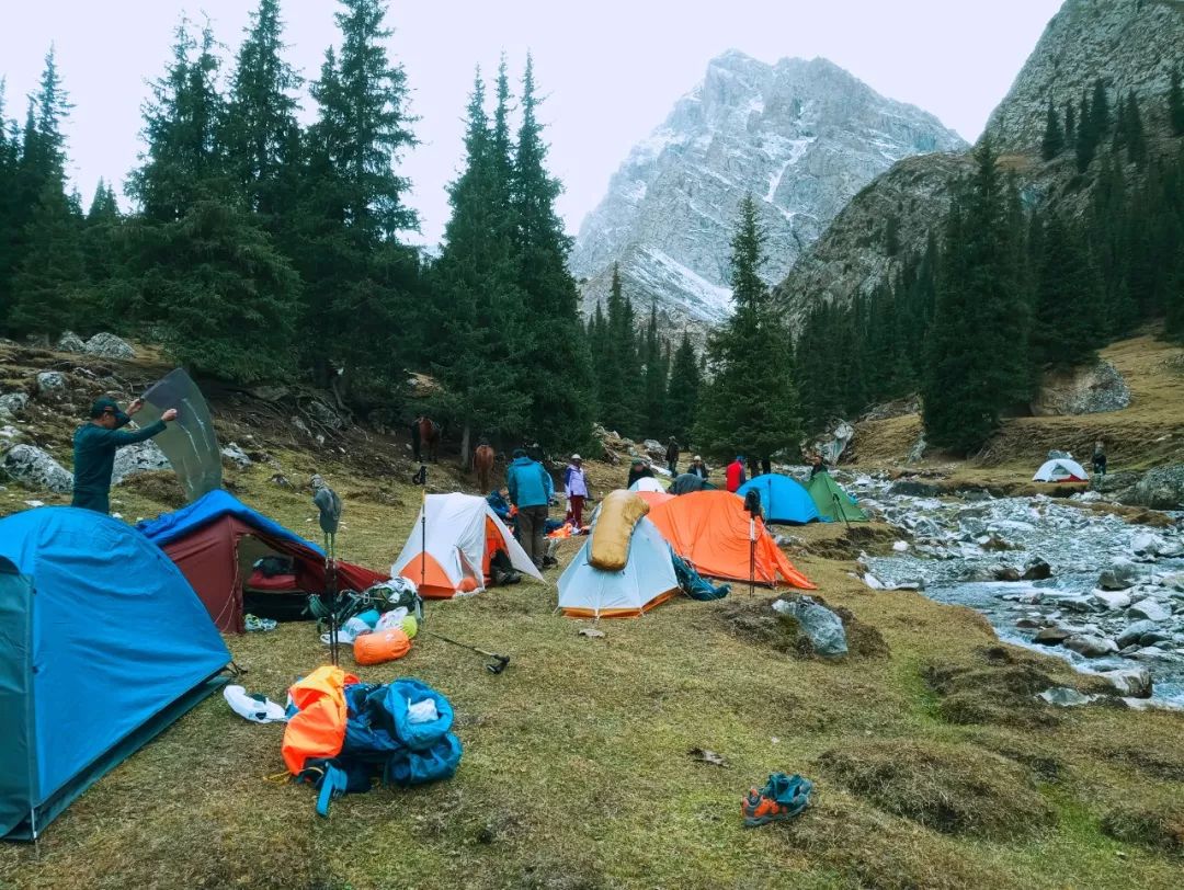 就这样我们来到了第三天的营地,海拔2600米左右的草原站附近,这个营地是三天内最漂亮最平整的一个营地。而且旁边就有一条溪流,当然不是主河道不用担心夜晚的河水暴涨。远处是高山,山顶是皑皑的白雪,周边全是树木,旁边是一条清澈的溪流,而我们的营地铺着一层微微泛黄的草地。旁边偶尔几块石块点缀其中,这个景直接看醉了。
