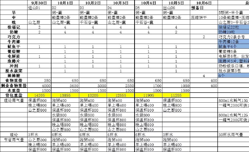 关于食物,奉上食物清单,及当时用气量用水量的表单!