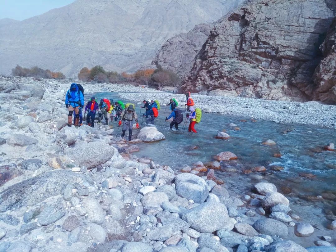 第三天恐怖的过河就开始了,直接上溯溪鞋,当天这个溯溪鞋从早上拔营后一直到下午才脱了,可想而知过了有多少条河流,当天过河总共超过20条,前一半的河流其实都是小溪,河水不急但必须要淌水过河。后一半也就是过科克苏河后的河流,是这几天里面最危险的,水流特别的急而且比较深。