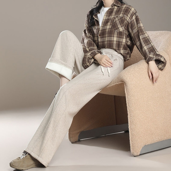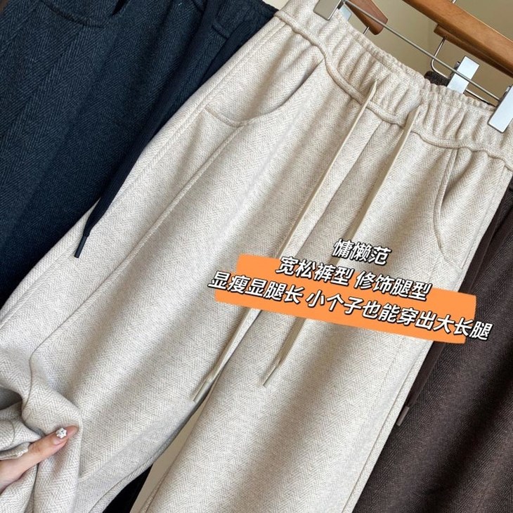 文案:穿上不想脱下的香蕉裤💥裤里宝宝绒超暖和,宽松版型上身不臃肿垂感十足~走动也不会贴腿!松紧腰不会勒肉不挑人穿,梨形大胆冲!