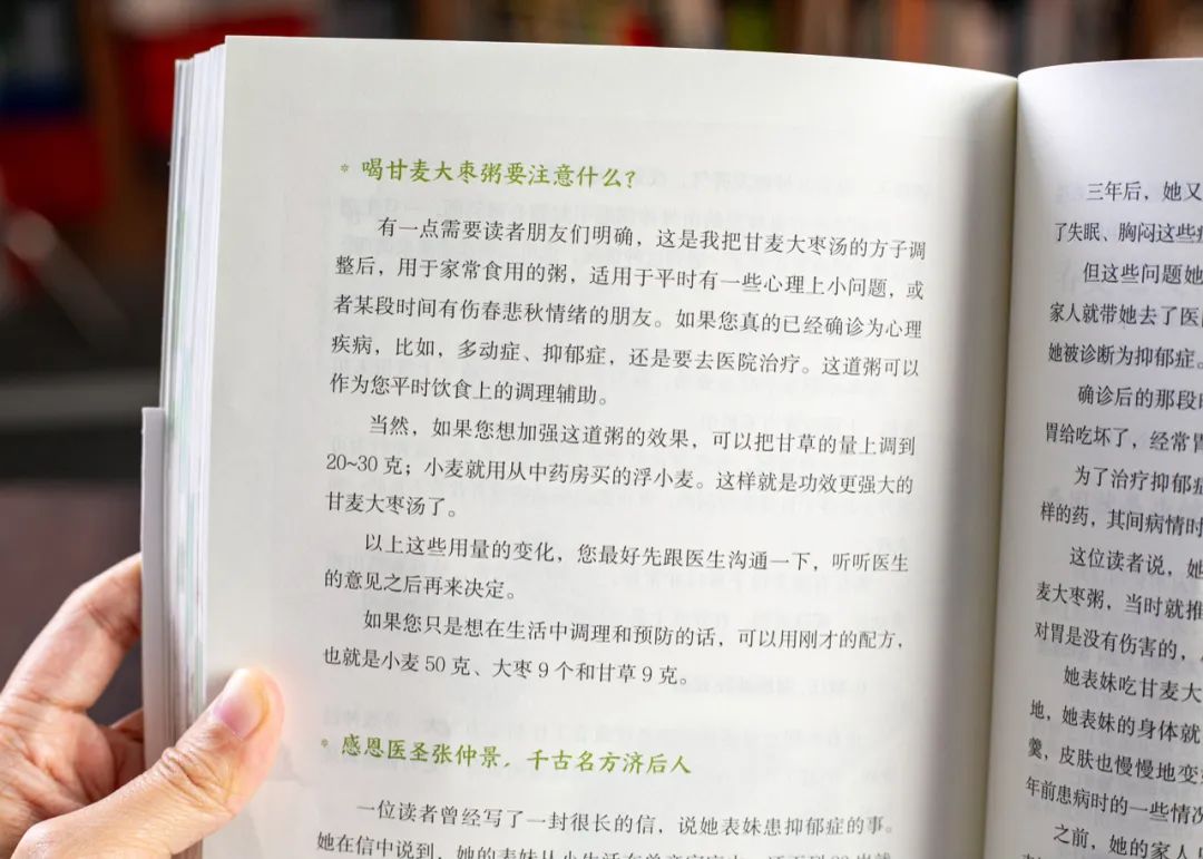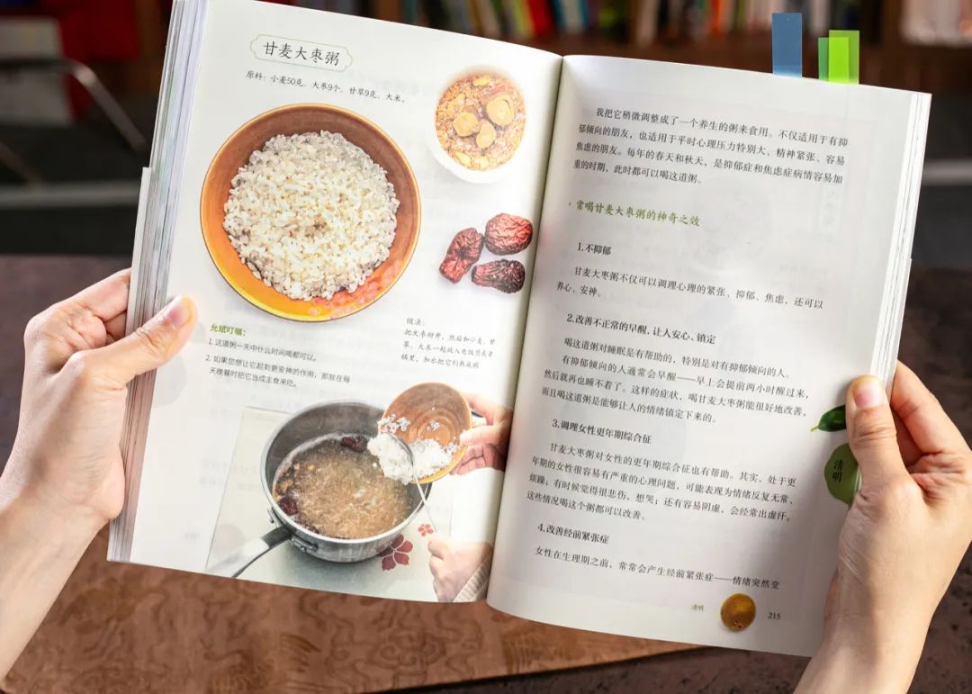 比如,春天是抑郁焦虑高发的季节,书中介绍了甘麦大枣粥,帮助心理压力大的朋友环缓解情绪。