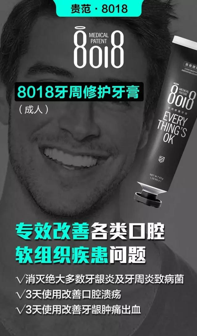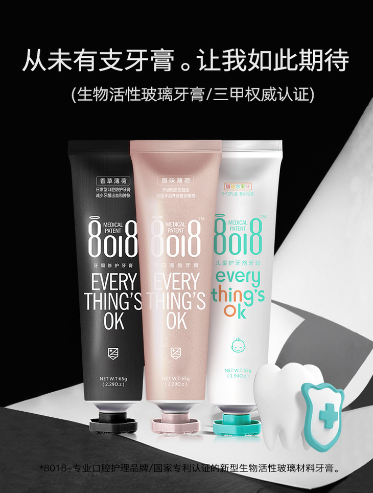 8018目前已推出三款牙膏:亮白固齿牙膏(成人)、牙周修护牙膏(成人)、儿童护牙剂牙膏。