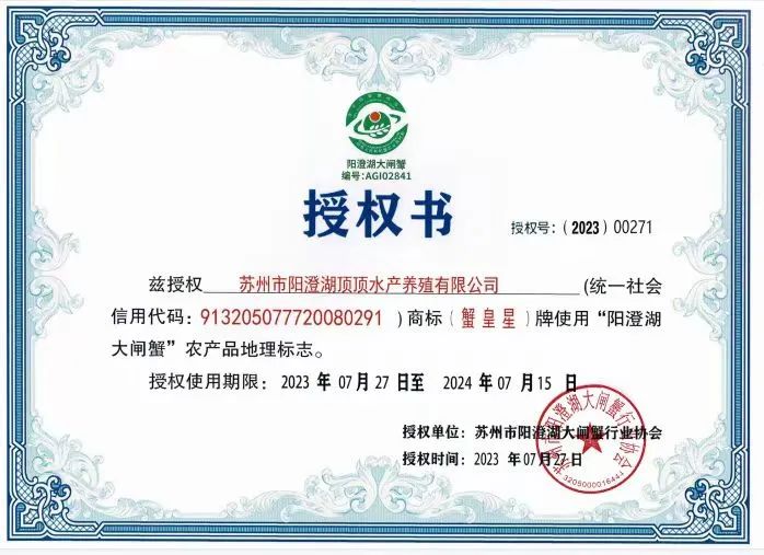 且蟹皇星大闸蟹还拥有苏州阳澄湖大闸蟹行业协会授予的本年度“农产品地理标志”。