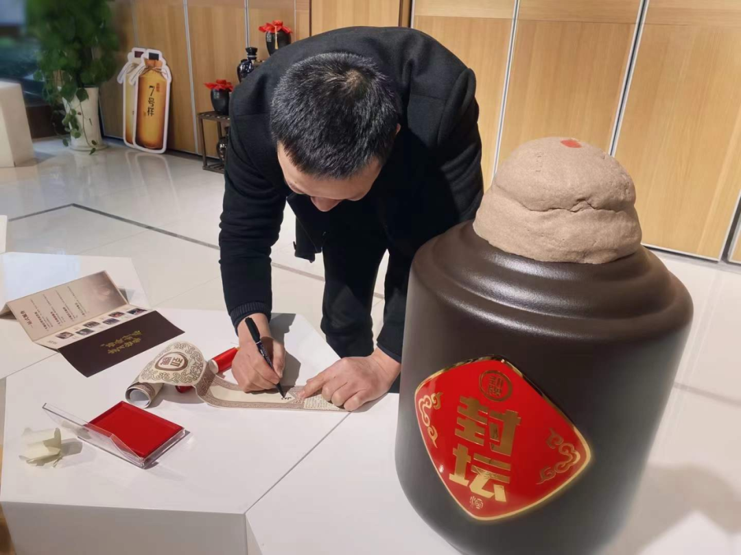 2月11日,大冶展销中心店员们一大早就紧锣密鼓的准备着,因为今天要迎来了一位特殊的客人——18L封坛酒的首位消费者。上午10时,客户准时到达,店长张浩宾热情的接待了客户,并详细的向客户介绍了封坛流程后,封坛仪式正式开始。经过点墨成文、藏福于礼、密盖封坛、加贴封条、红绸盖冕、合影留念6个环节后,封坛仪式礼成。
