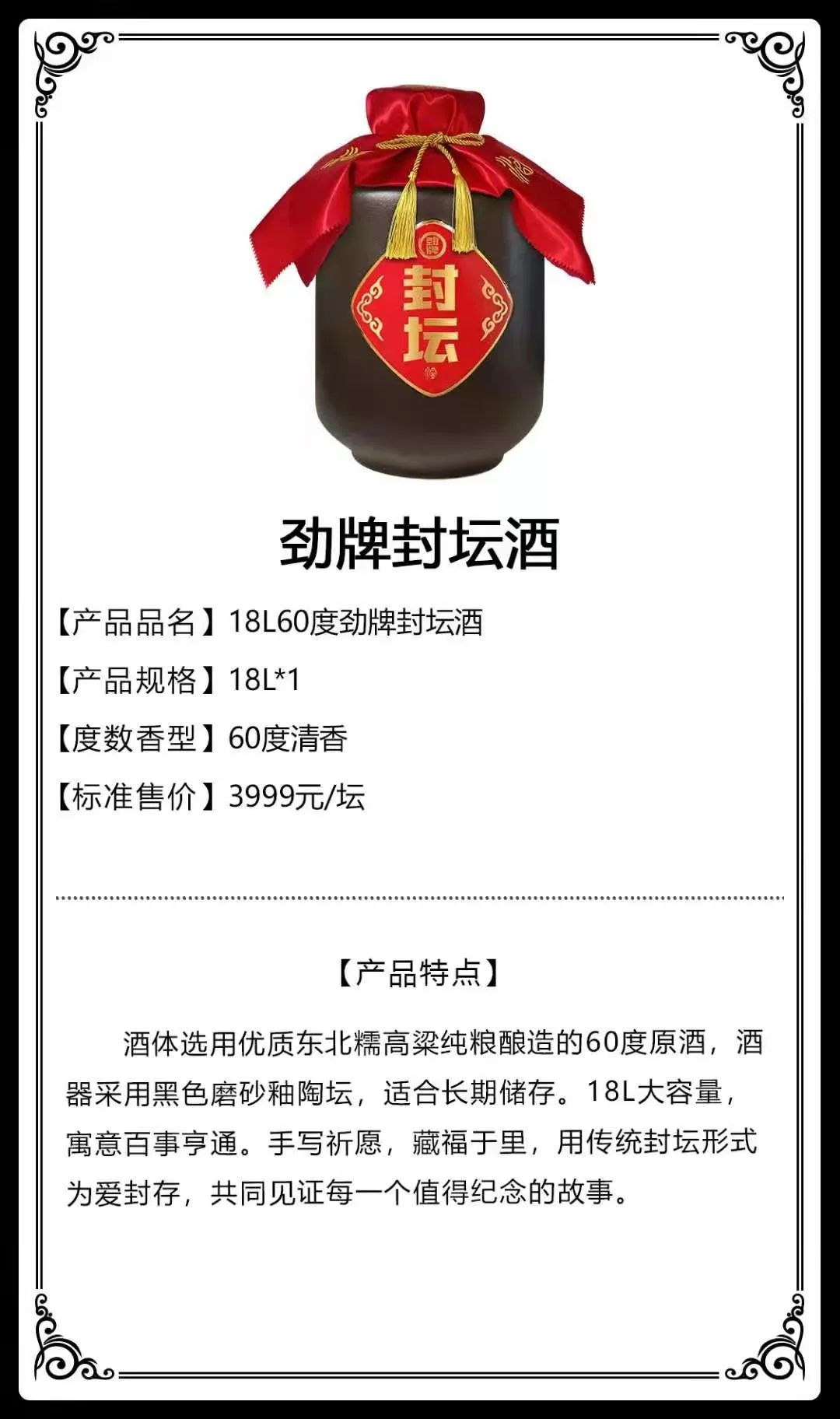 18L封坛酒是新营销事业部围绕营销场景及体验式服务打造的一款特色产品,该产品定位为大众化封坛酒,借助产品封坛仪式加强消费者的互动黏性,此产品仅限劲牌展销中心门店及藏酒阁门店销售。